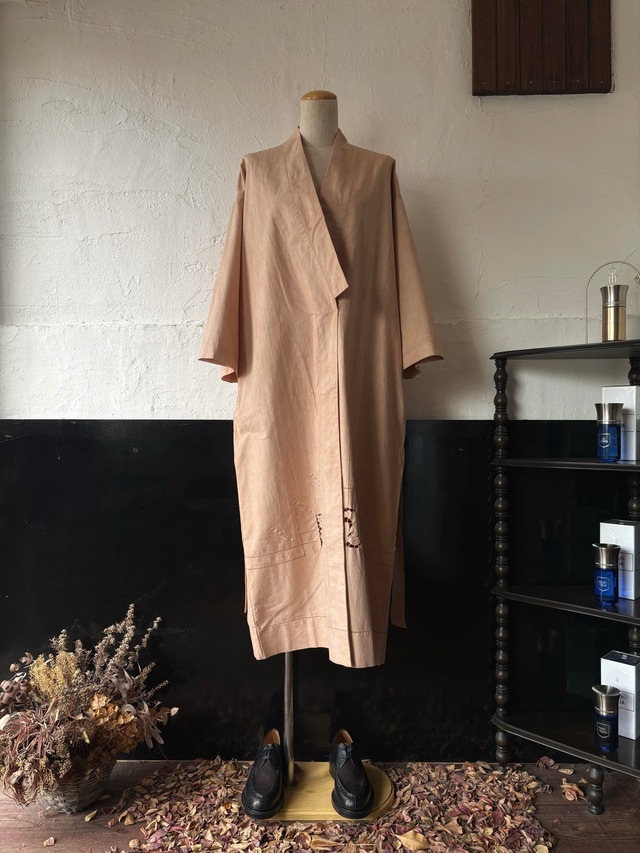 アンティークのベッドリネンをアボカドの種と皮から得られた自作の有機顔料で染色し、仕立てたドレス。 各ピースは手作業で刺繍しています。 oundのデザイナーは長年に渡ってアンティークのベッドリネンを収集してきました。 100年ほど前、人々の暮らしがまだゆっくりとしたペースだった頃、 紡績業は始まったばかりで、機械は今よりもゆっくりと、素材に対しても敬意を払って動いていました。 現在ではすべてのスピードが速くなり、可能な限り低価格で、可能な限り短時間で、 可能な限り大量に、何かを生み出していきます。 それは材料にも大きなストレスを与えます。 100年前のように物が長持ちしない理由には、そのような背景があります。 かつて女性たちは日々刺繍を施しながら、生涯をともにする親密な作品を作り上げていきました。 そうやって時間をかけて作られたものが人々の暮らしに寄り添い、日々を見守ってきましたが、 作った人やその持ち主がいなくなると、愛情をこめて、高い技術を持って作られたものもただの「古いもの」として処分され続けているのが現状です。 oundのrepurposedラインは、その意義を取り戻し、再び使えるものとして、 新たな価値を与えるコレクション。 肩幅 53.5cm 身幅 65cm 着丈 123cm 袖丈 40cm ound cina robe dress Size free Color avocado Material linen 100%