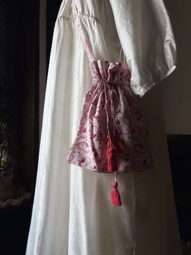 手織りのシルク生地にを花柄をプリント、その花の花芯全てに手刺繍を施した、BUNONオリジナルのテキスタイル。 定番的に展開している巾着タイプのバッグは、コーディネートに華やかさを加えてくれます。 横 24cm 縦 29cm 持ち手 39cm BUNON embroidery drawstring shoulder bag Size free Color musk coral material silk 100%