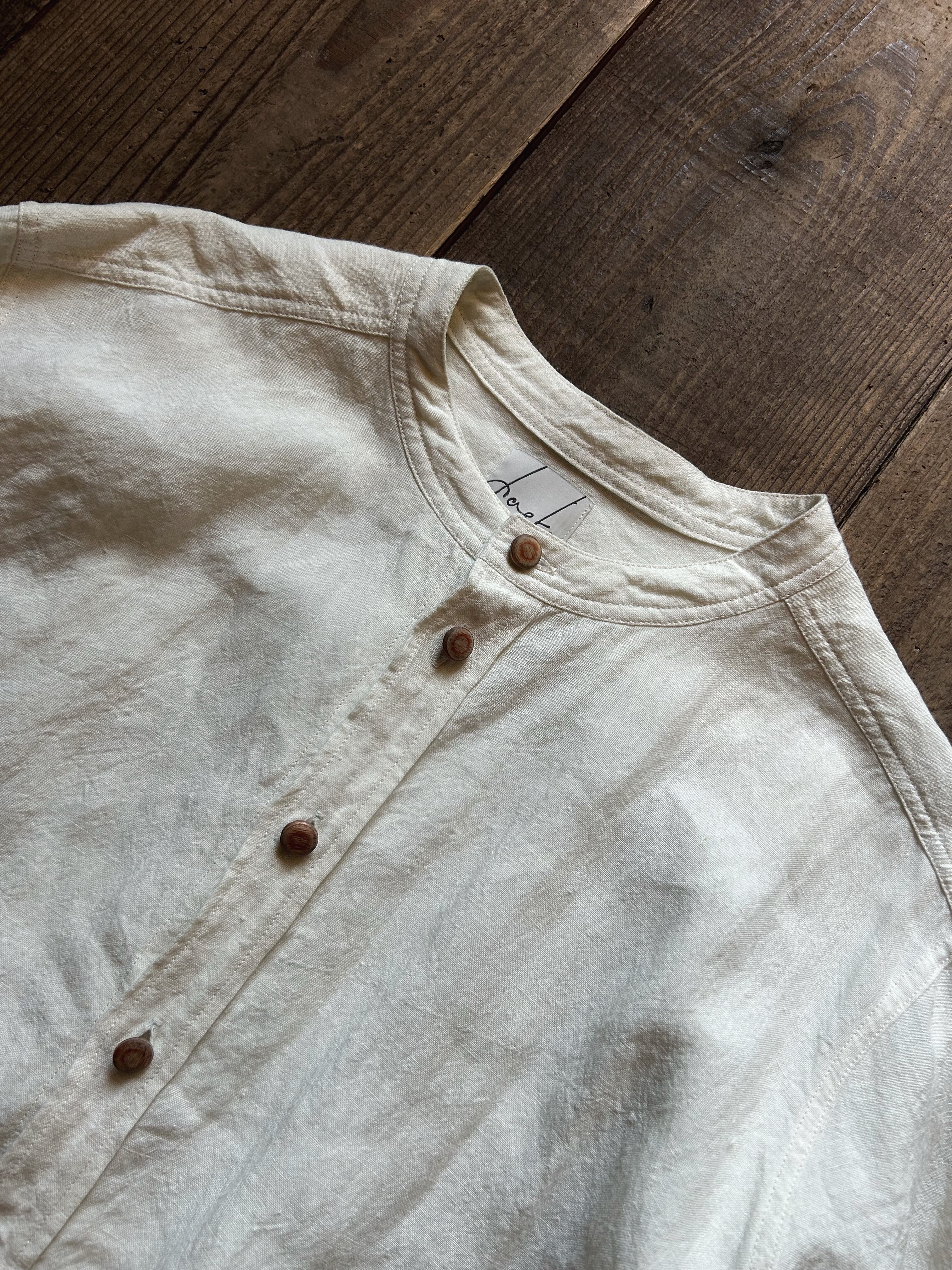 釦はウッドボタンを使用しているのですが、通常のウッドボタンはニスが塗られいる為、それを取り除く為に一度鍋で煮て、ナチュラルな状態しています。