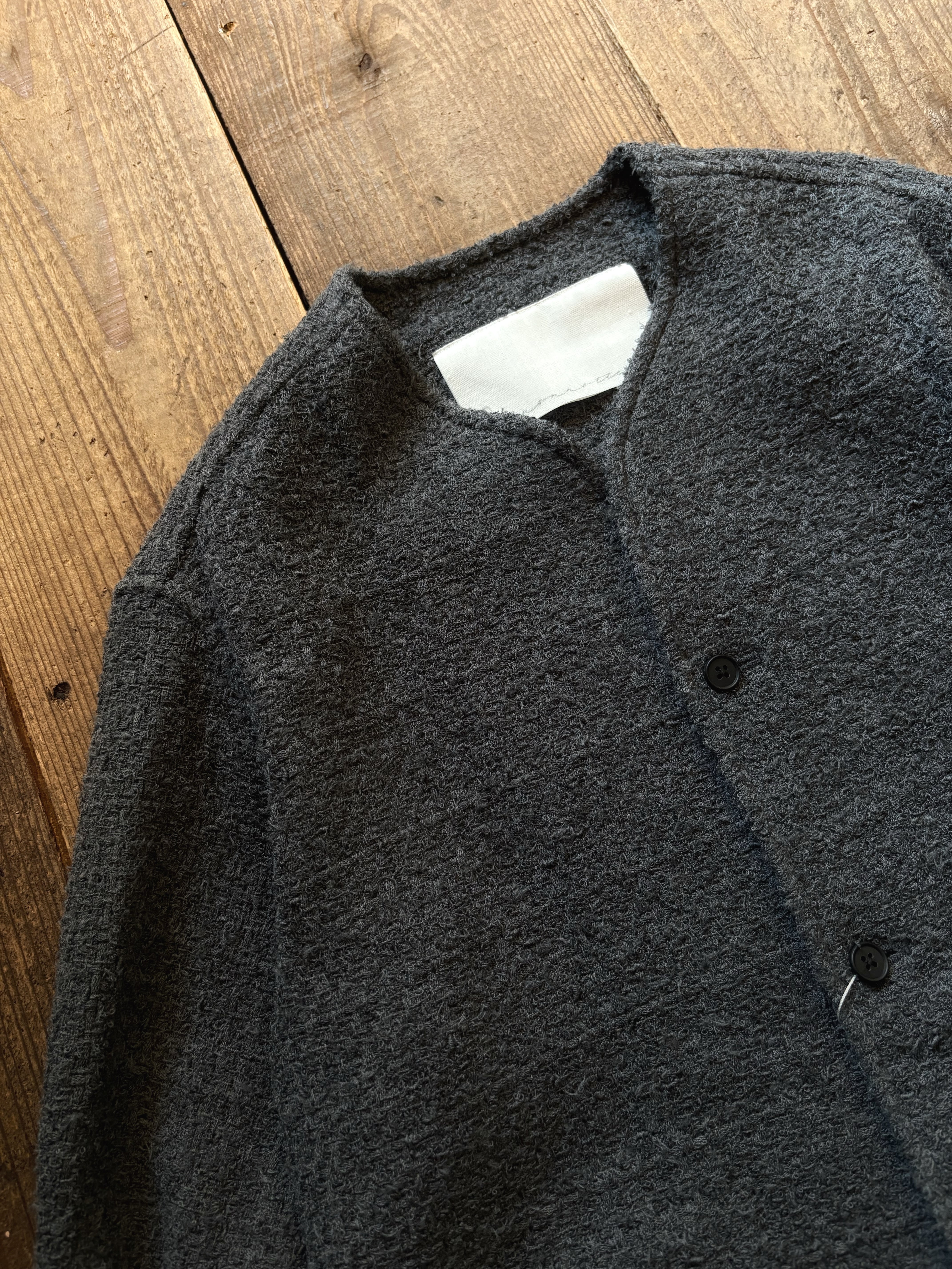 フリンジの糸や、ノットヤーン、丸胴のチューブ状の糸など、自分の理想とする5種類全てを今回のツイードに織り込み、 あえて5種類の糸全てを1色にすることで、無地面の中に奥行きと表情を込めて作って頂きました。