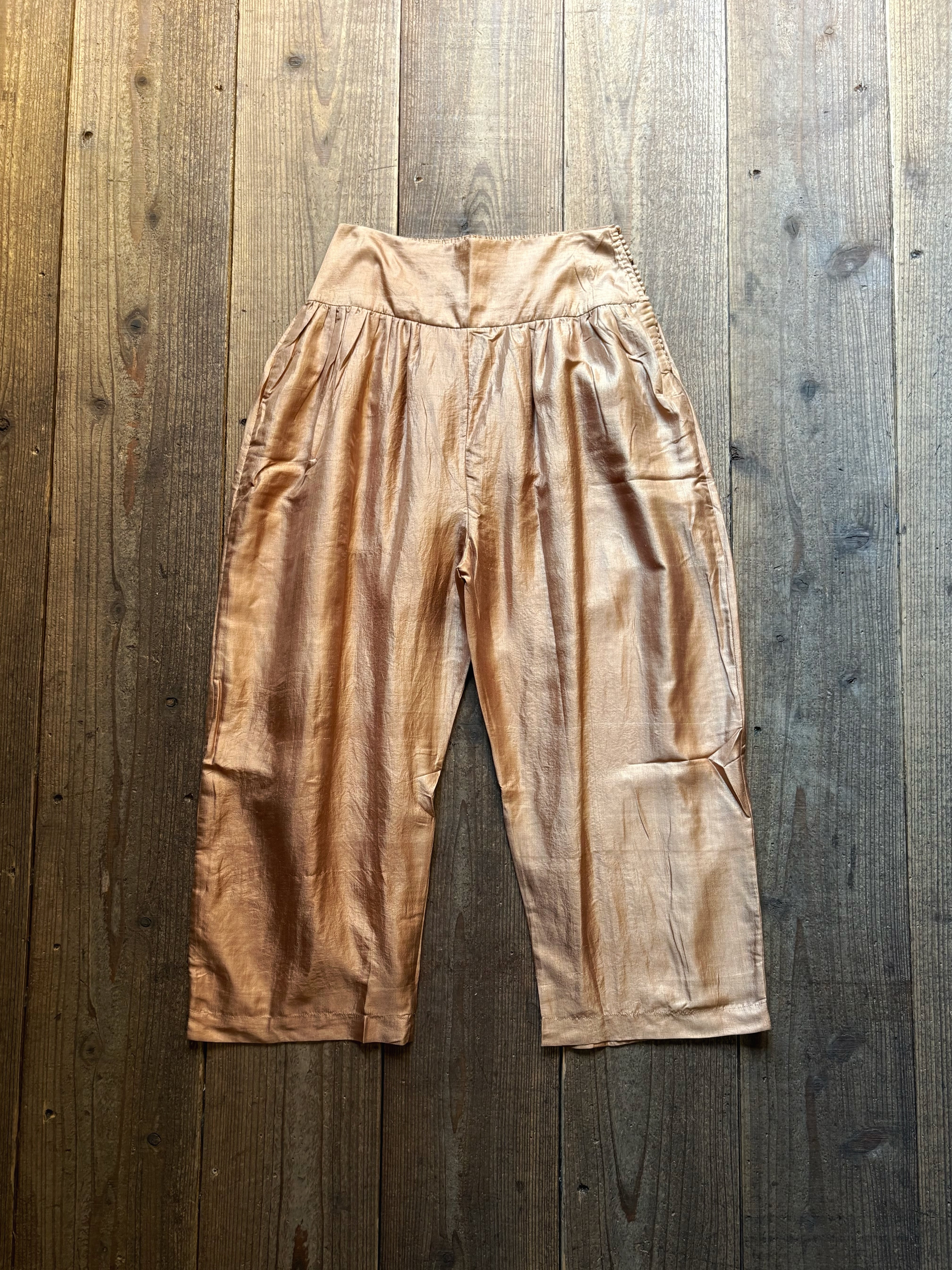 定番的に展開している、手紡ぎ手織りのカディシルクを使用したワイドシルエットのパンツです。