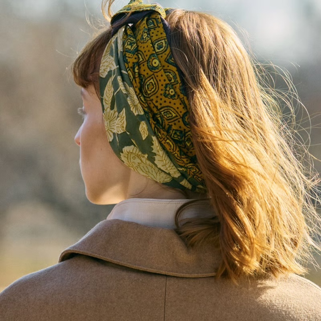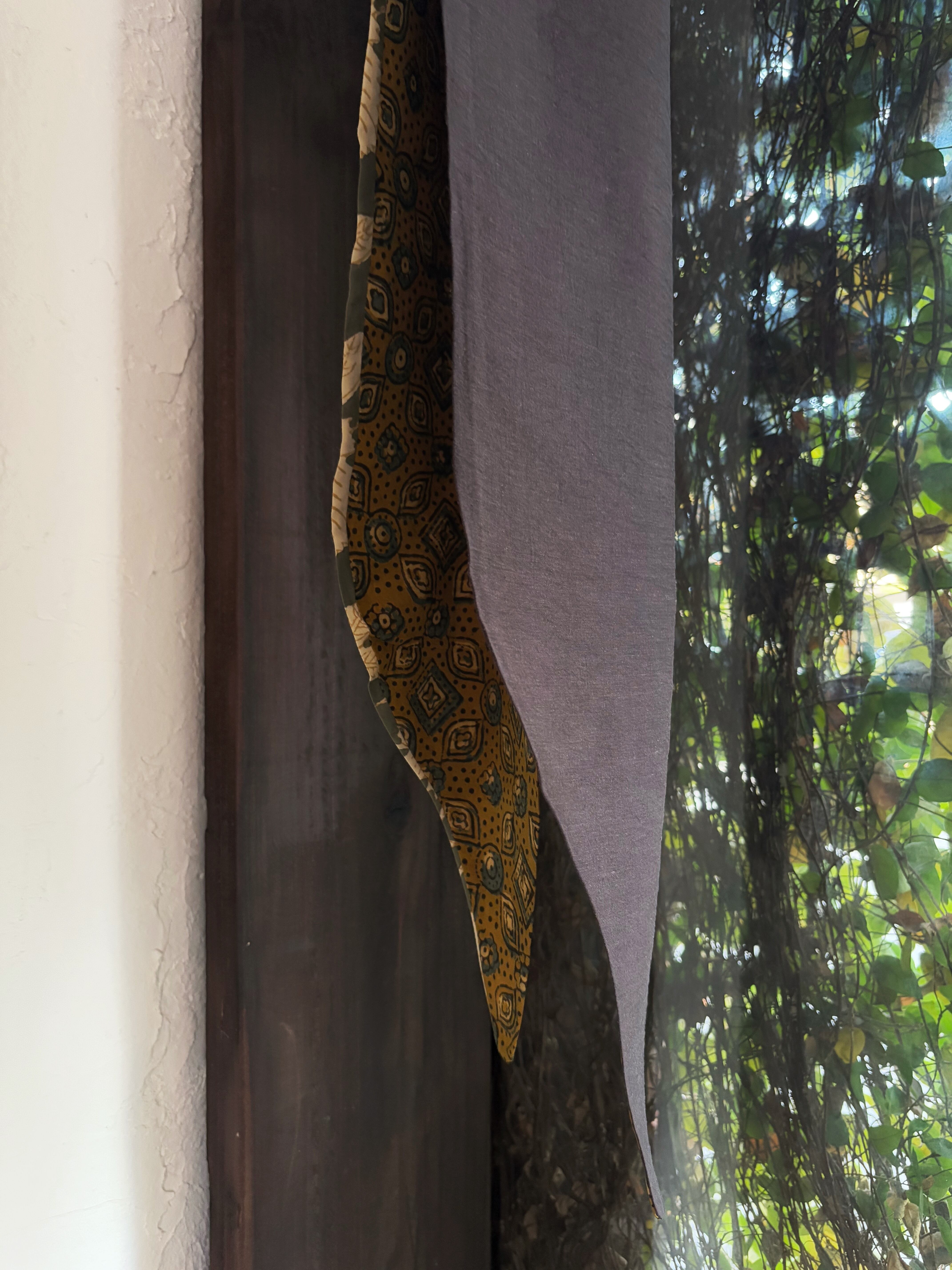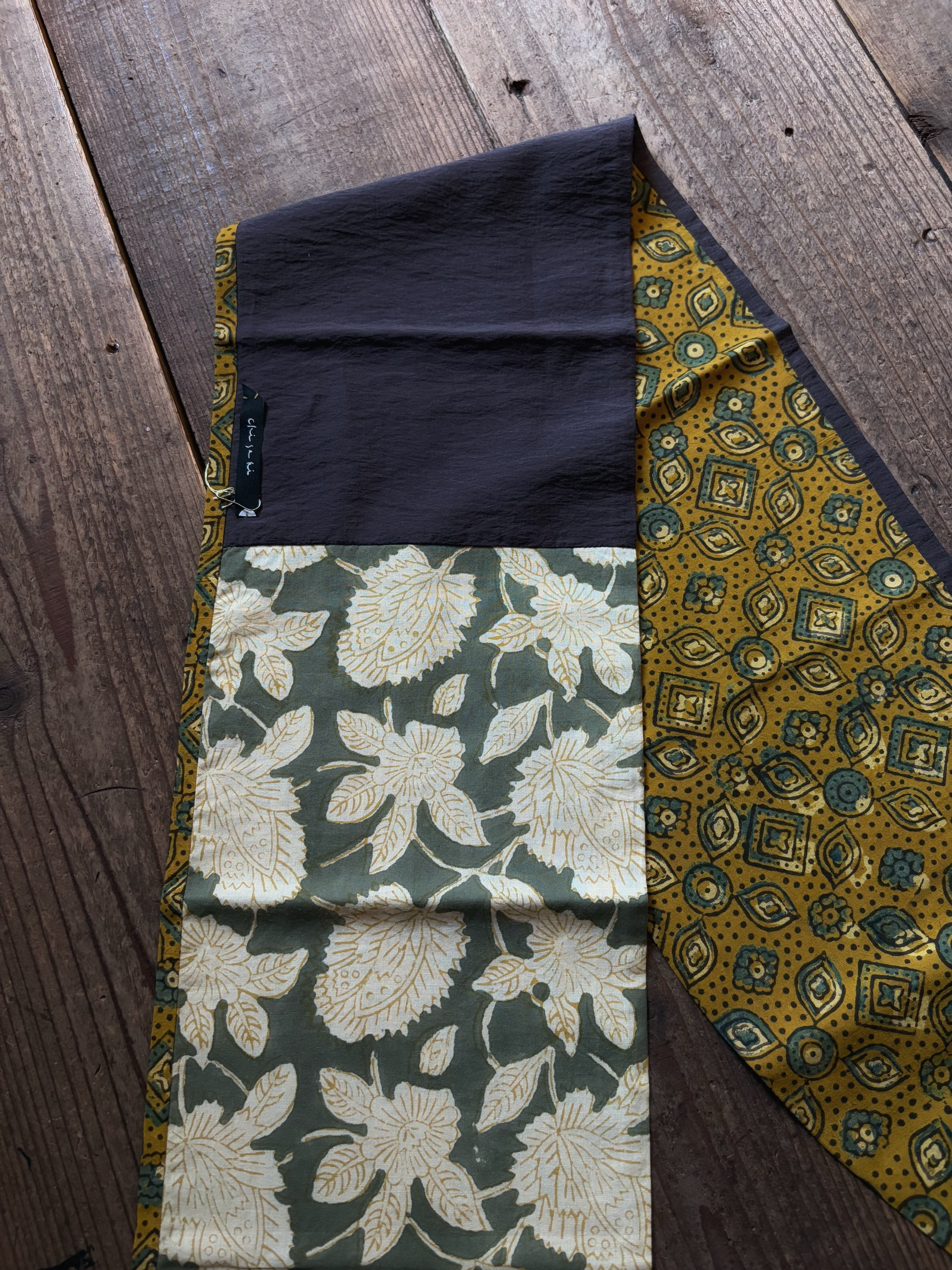 インドのブロックプリントで生み出された柄は、ハンドプリントならではの揺らぎのある表情で、独特のライン、配色はどこにもないオリジナリティを感じます。