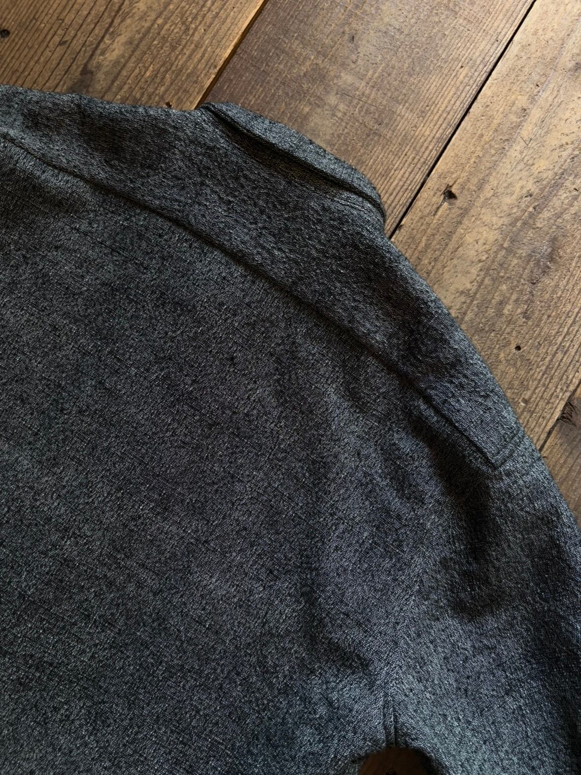 現代の二枚衿のように、台衿と上衿で分けて、キレイなシルエットが出るように寸法をしっかり取れる構造にした、完成された衿ではないのですが、多少、寸法やパターン的に無理があっても、そのような事は承知の上でもカタチになっている(なってしまっている)一枚衿にただただ魅力を感じて、この衿を採用しています。