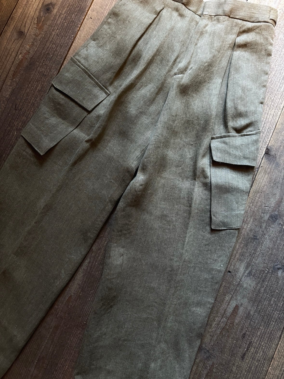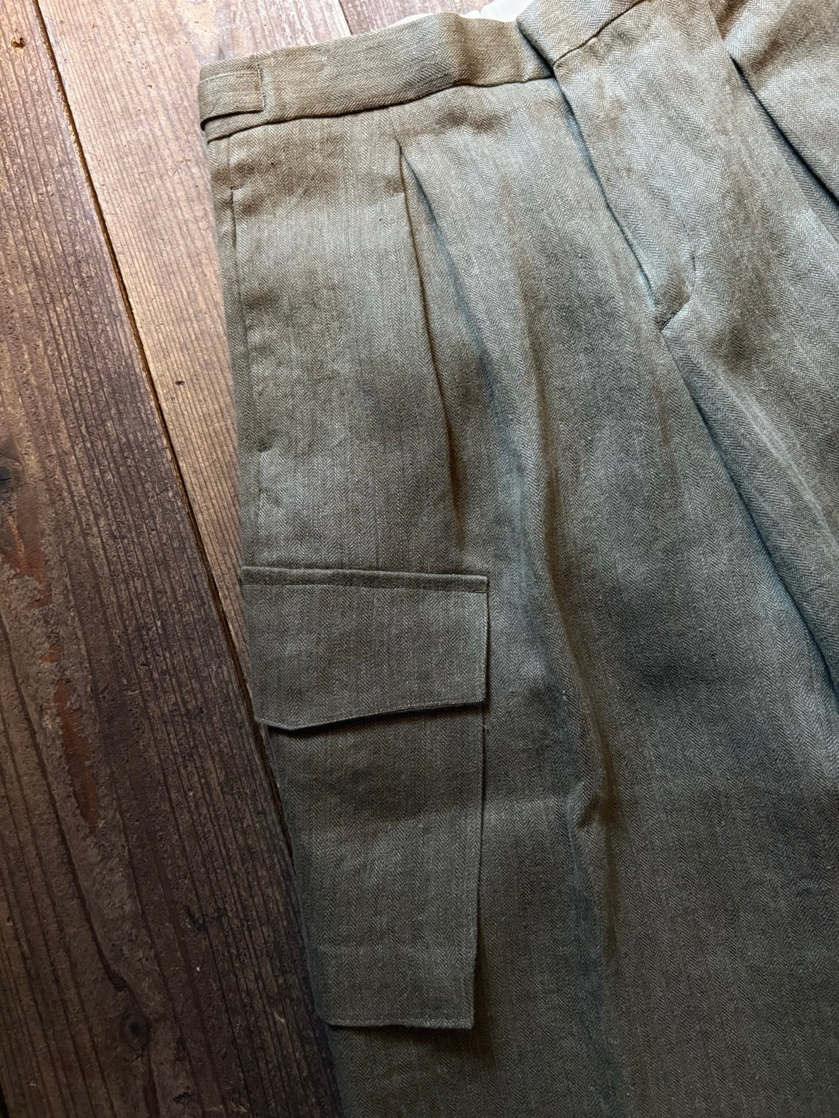 ヘヴィーリネンのヘリンボーンのオリーブカーキ。