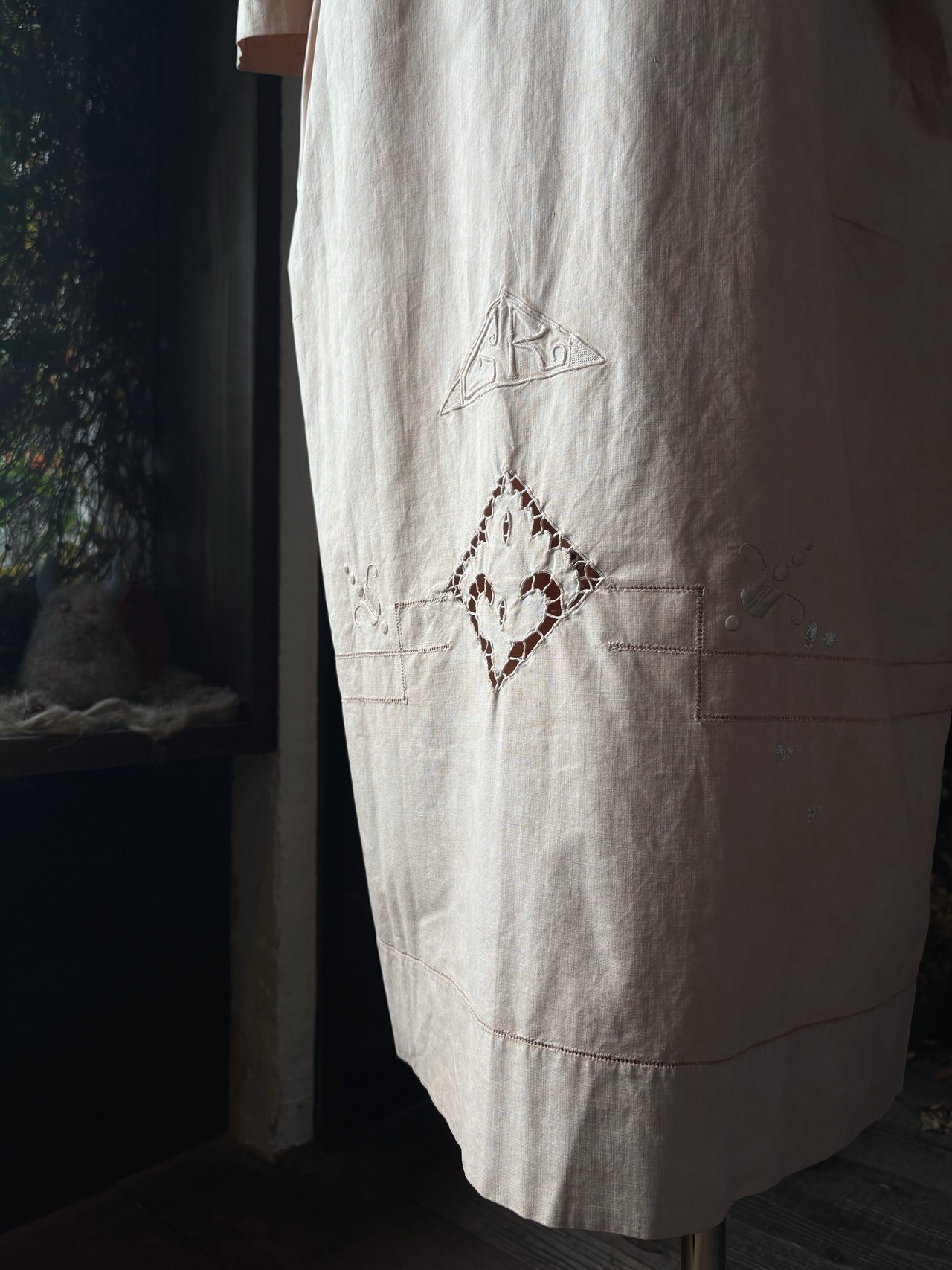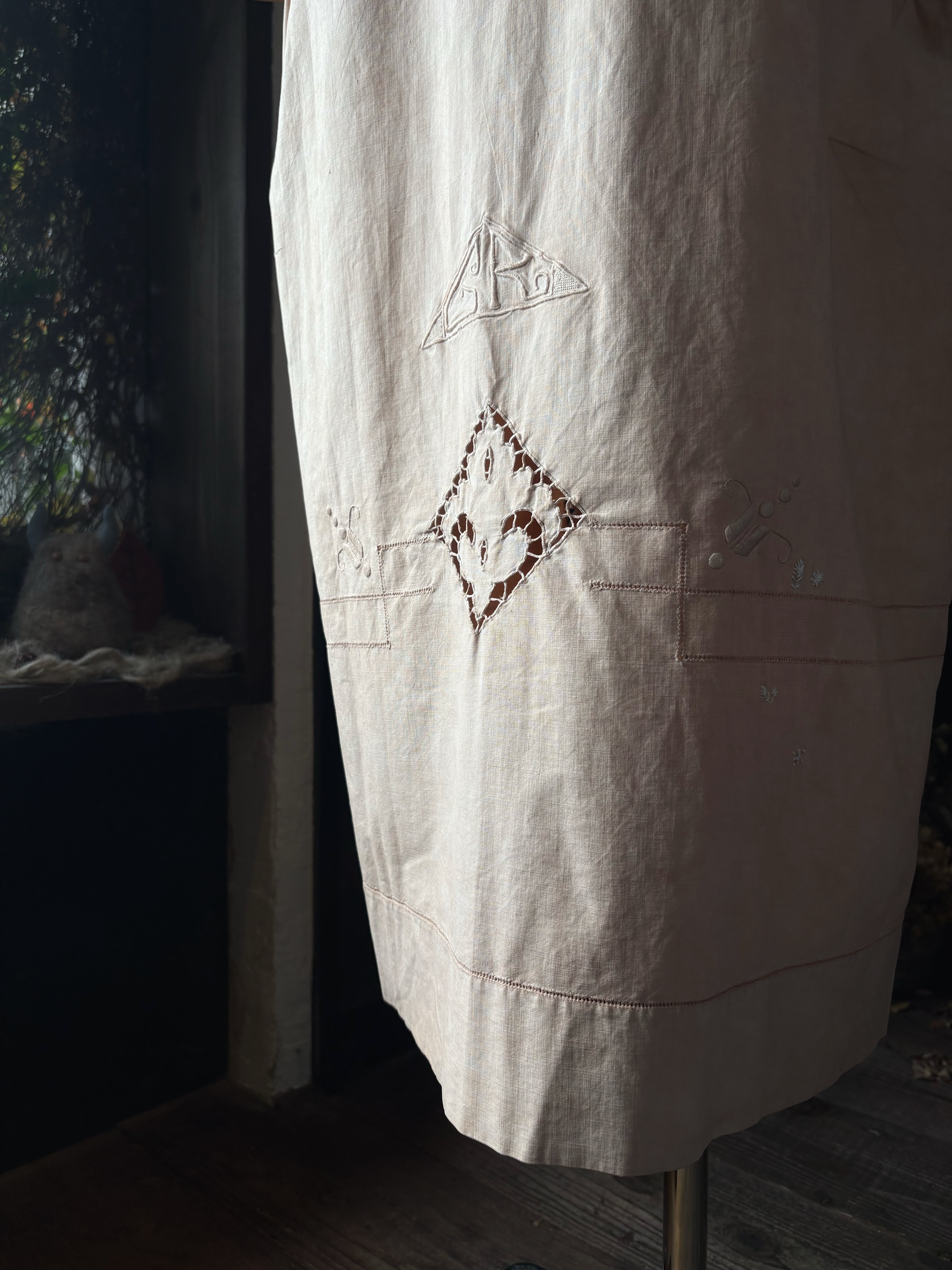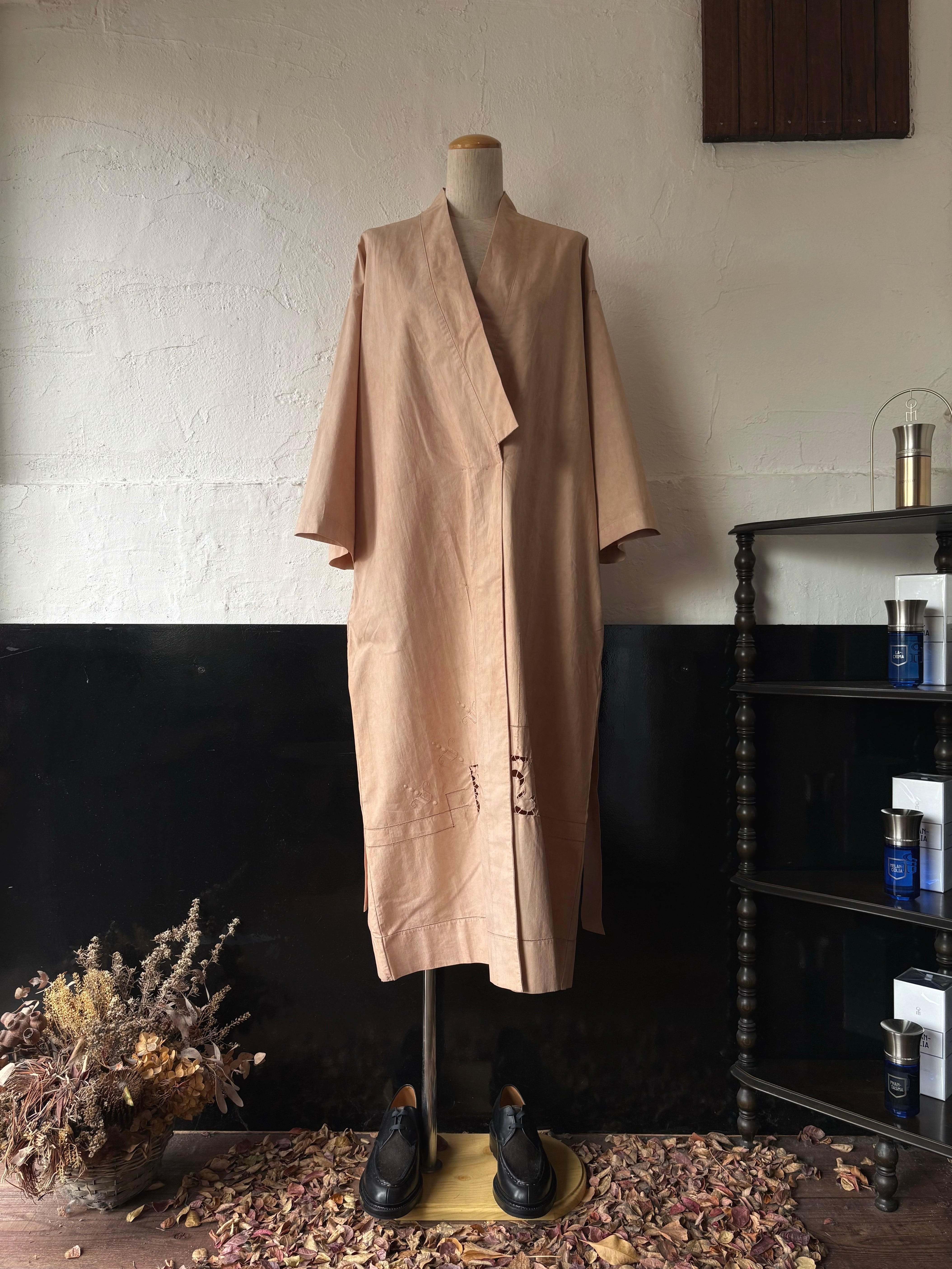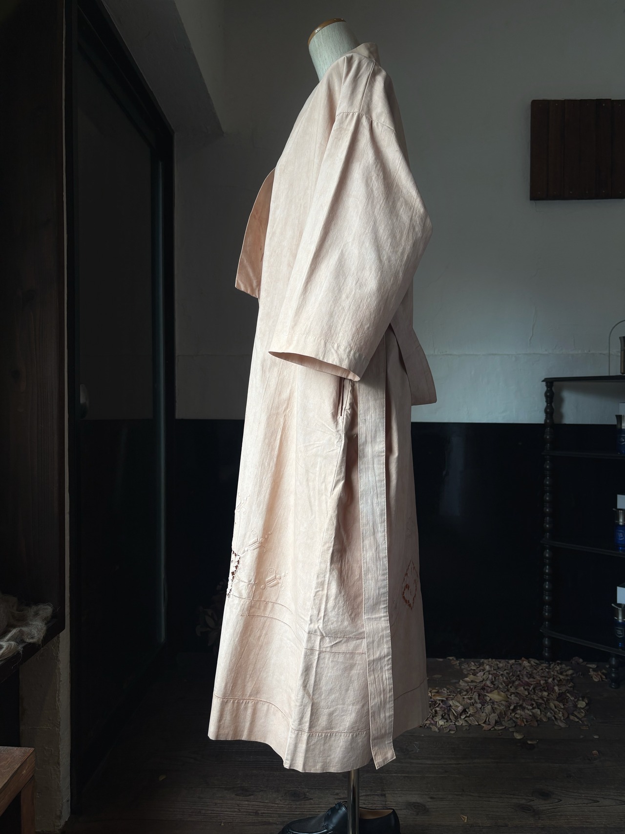 アンティークのベッドリネンをアボカドの種と皮から得られた自作の有機顔料で染色し、仕立てたドレス。