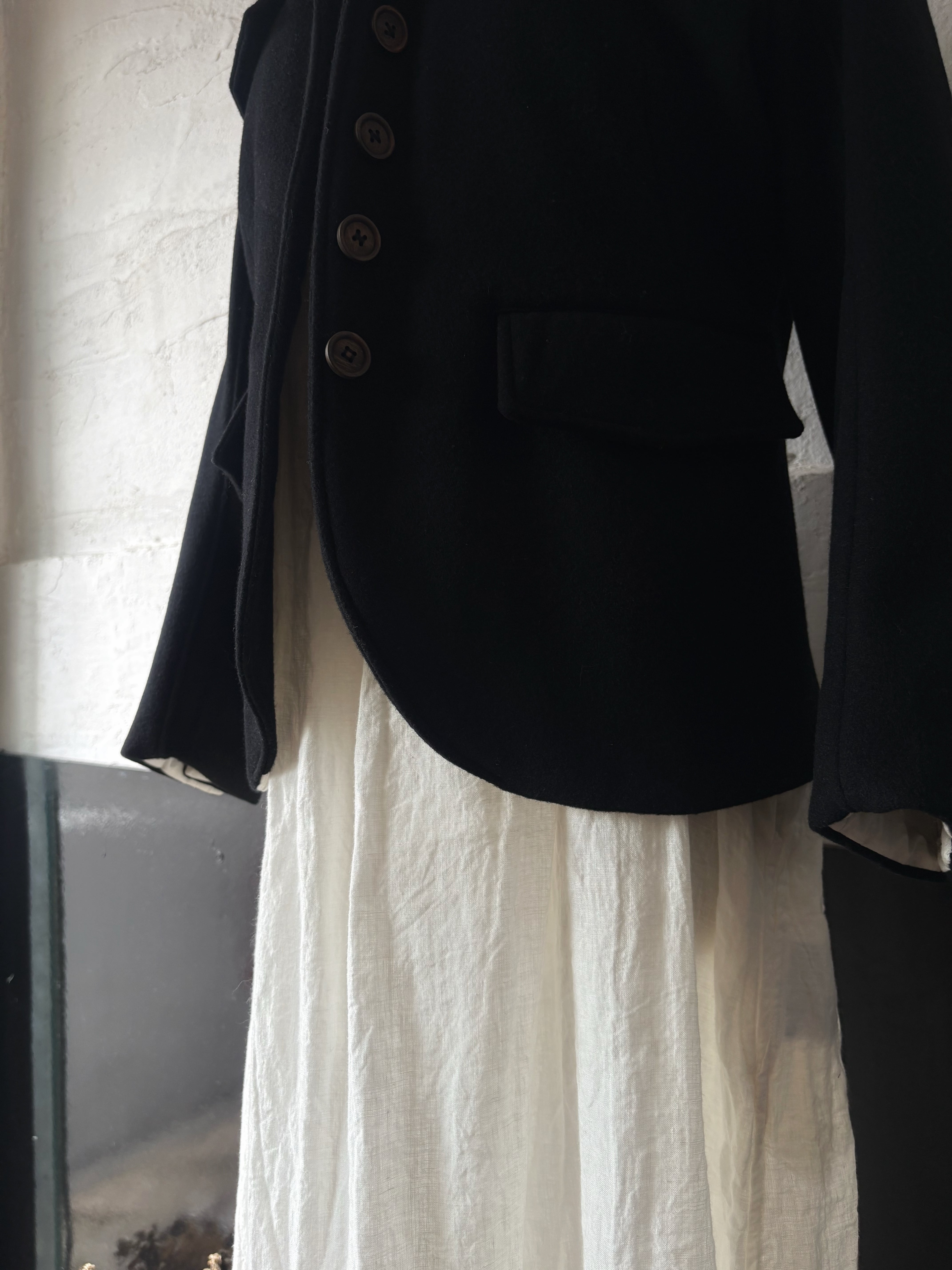 古い時代のジャケットは現代人とは違い、食生活等が原因で比較的小柄だった当時の人に合わせて仕立てている為、コンパクトなものが多いのですが、こちらのジャケットは少しゆとりを感じる事ができるサイズ感を目指しました。