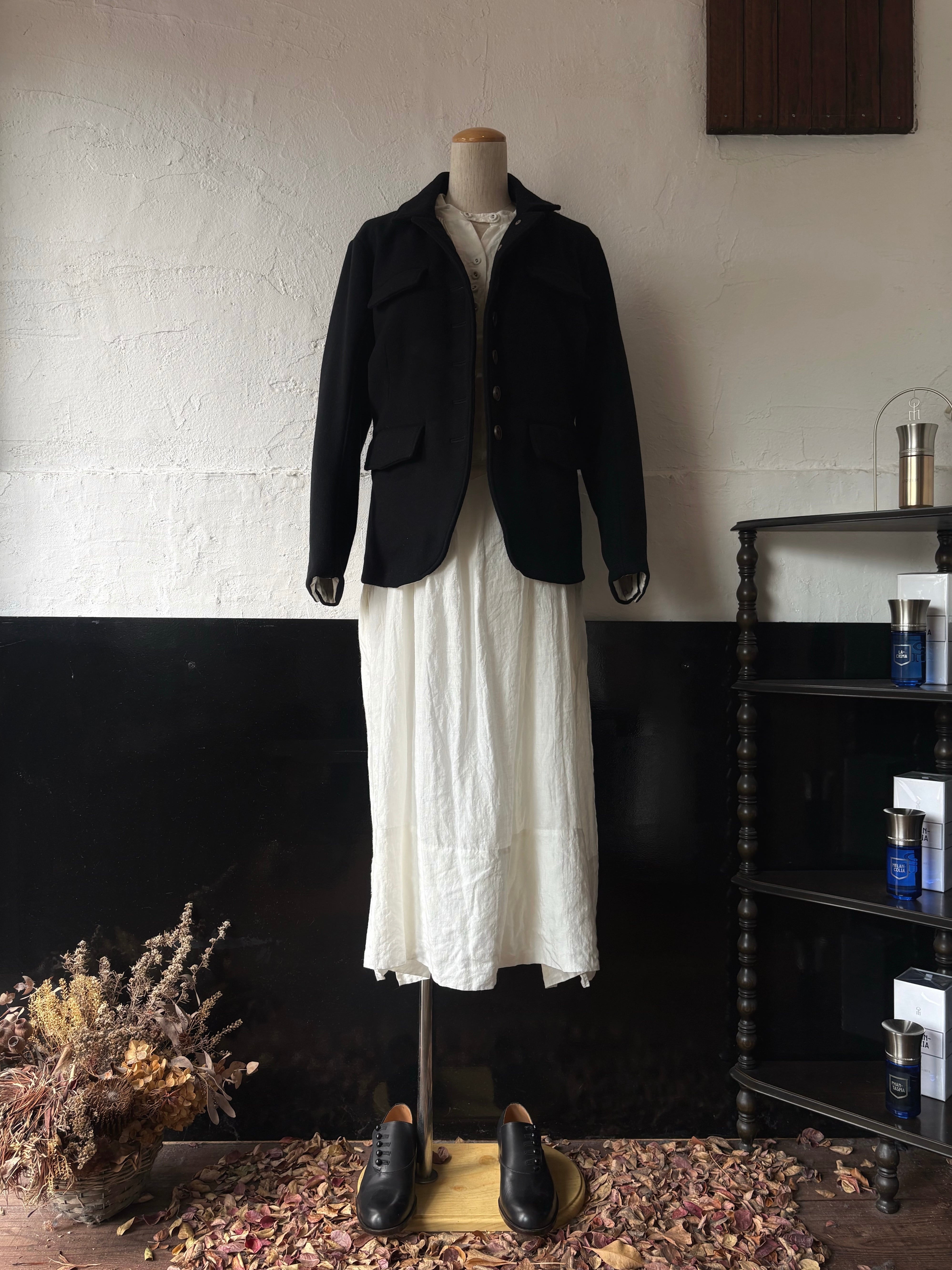 生地は勿論、シルエットやディテール、釦や糸に至るまで、デザイナーと打ち合わせを重ね、ライブ感も重視しながら完全別注にて仕立てていただいた、古い時代のハンティングジャケットになります。