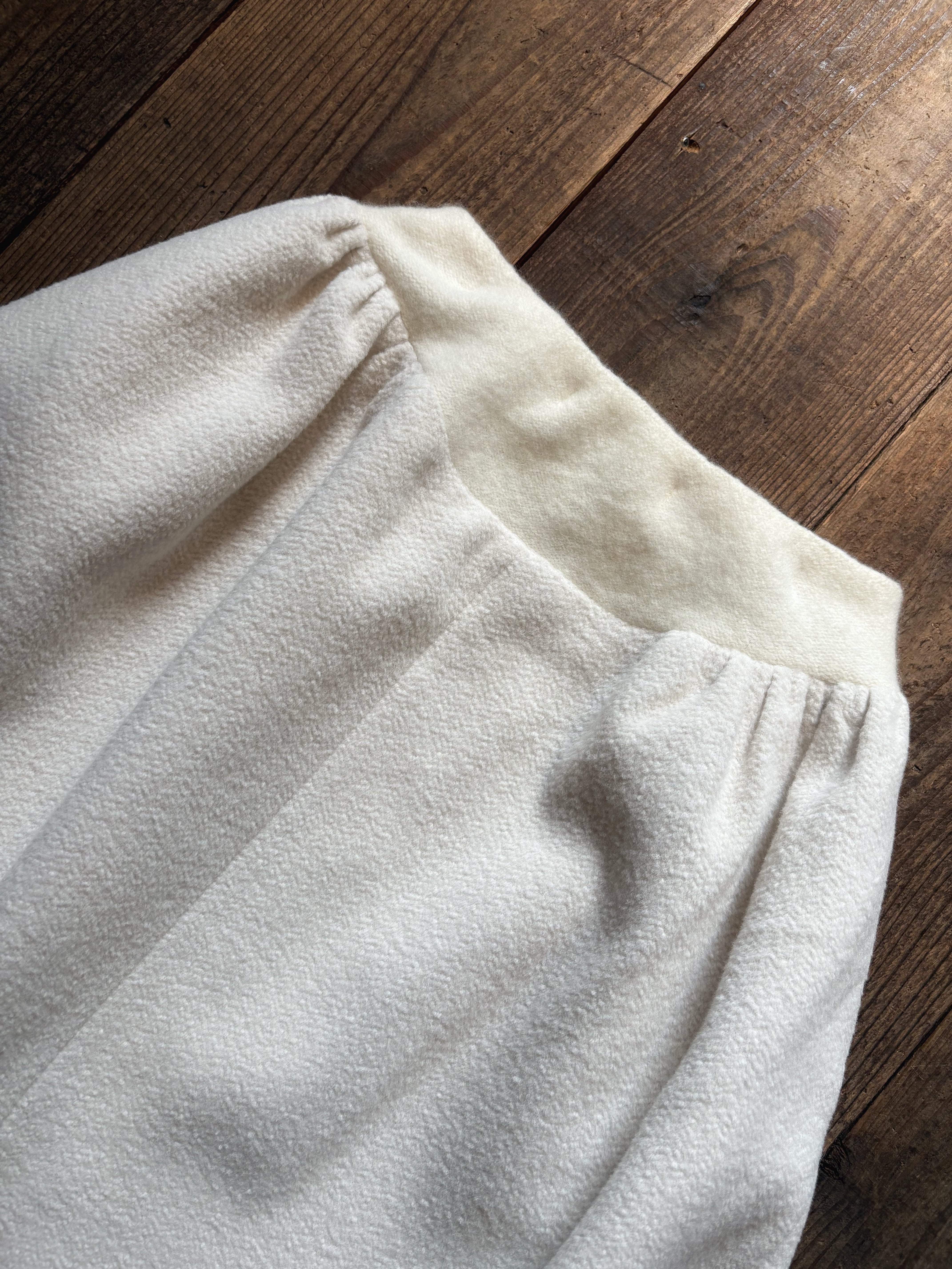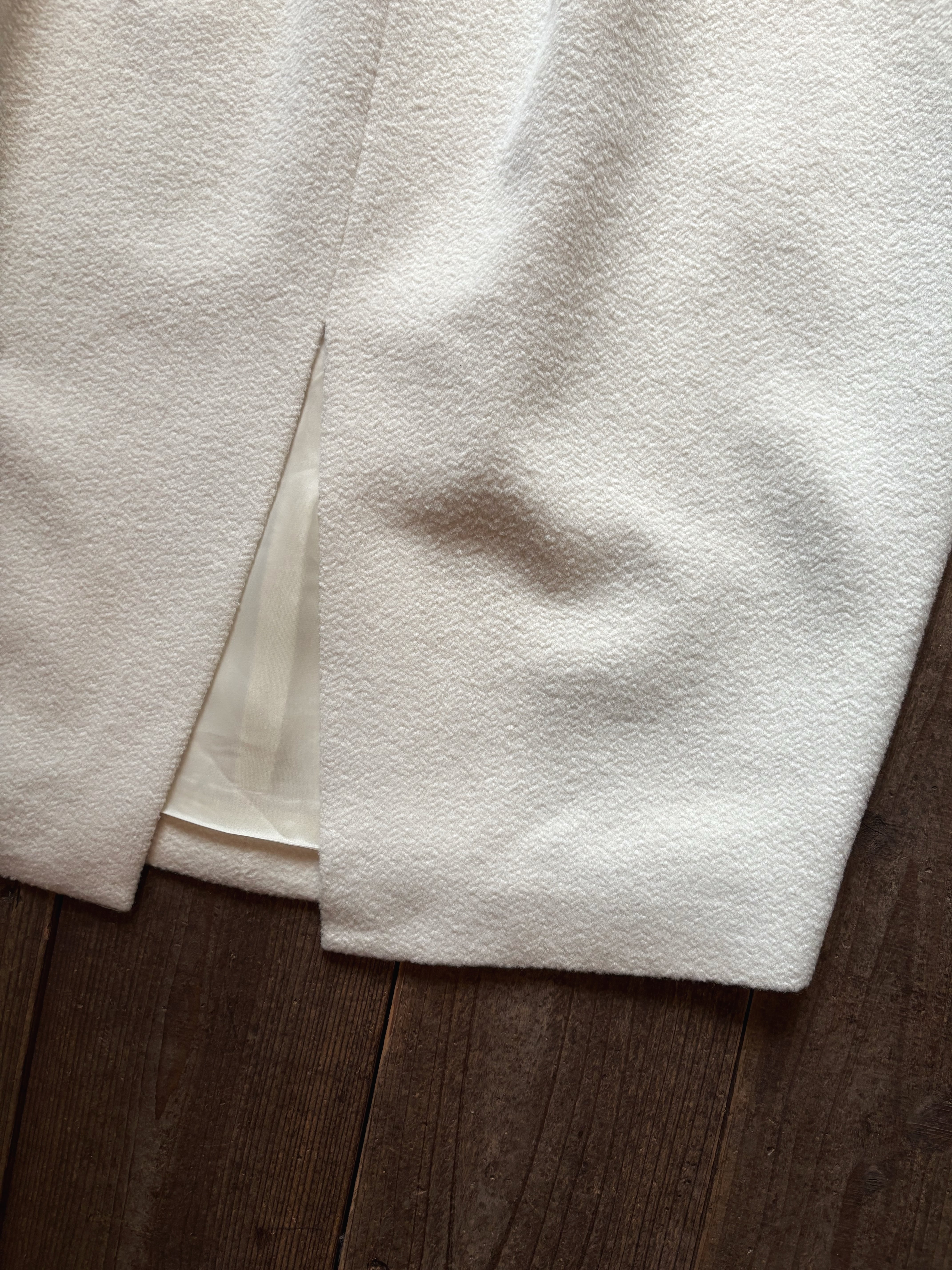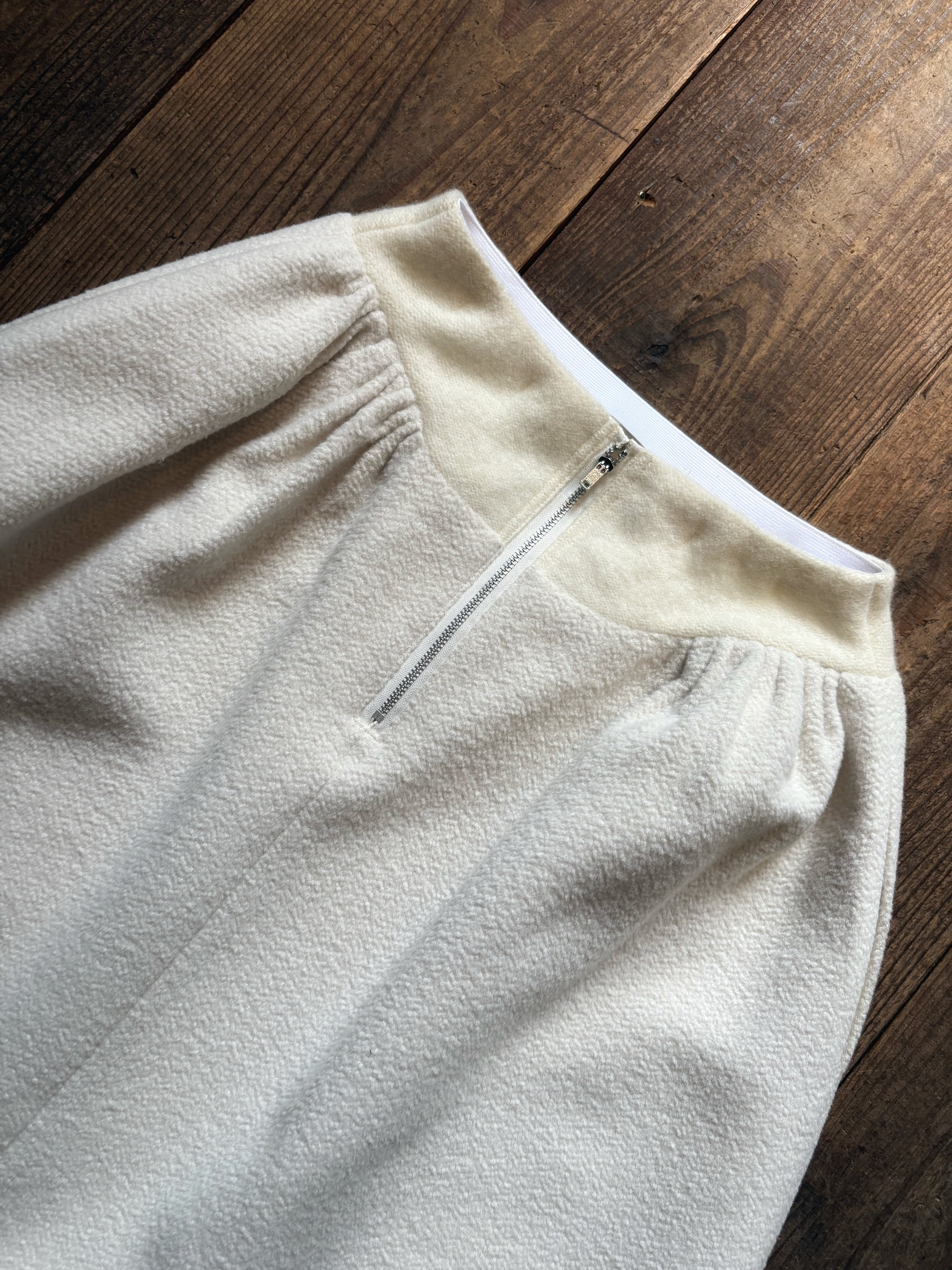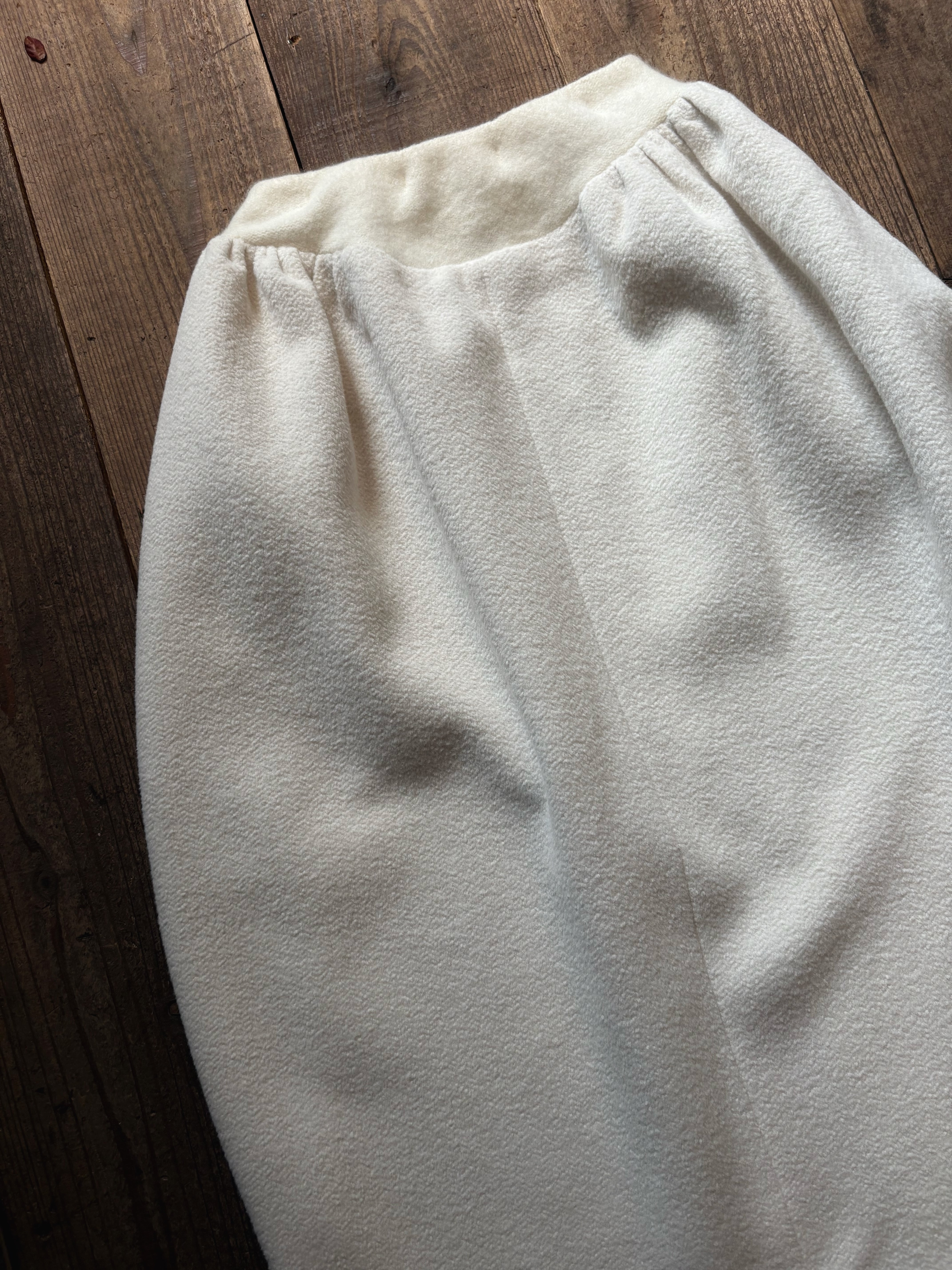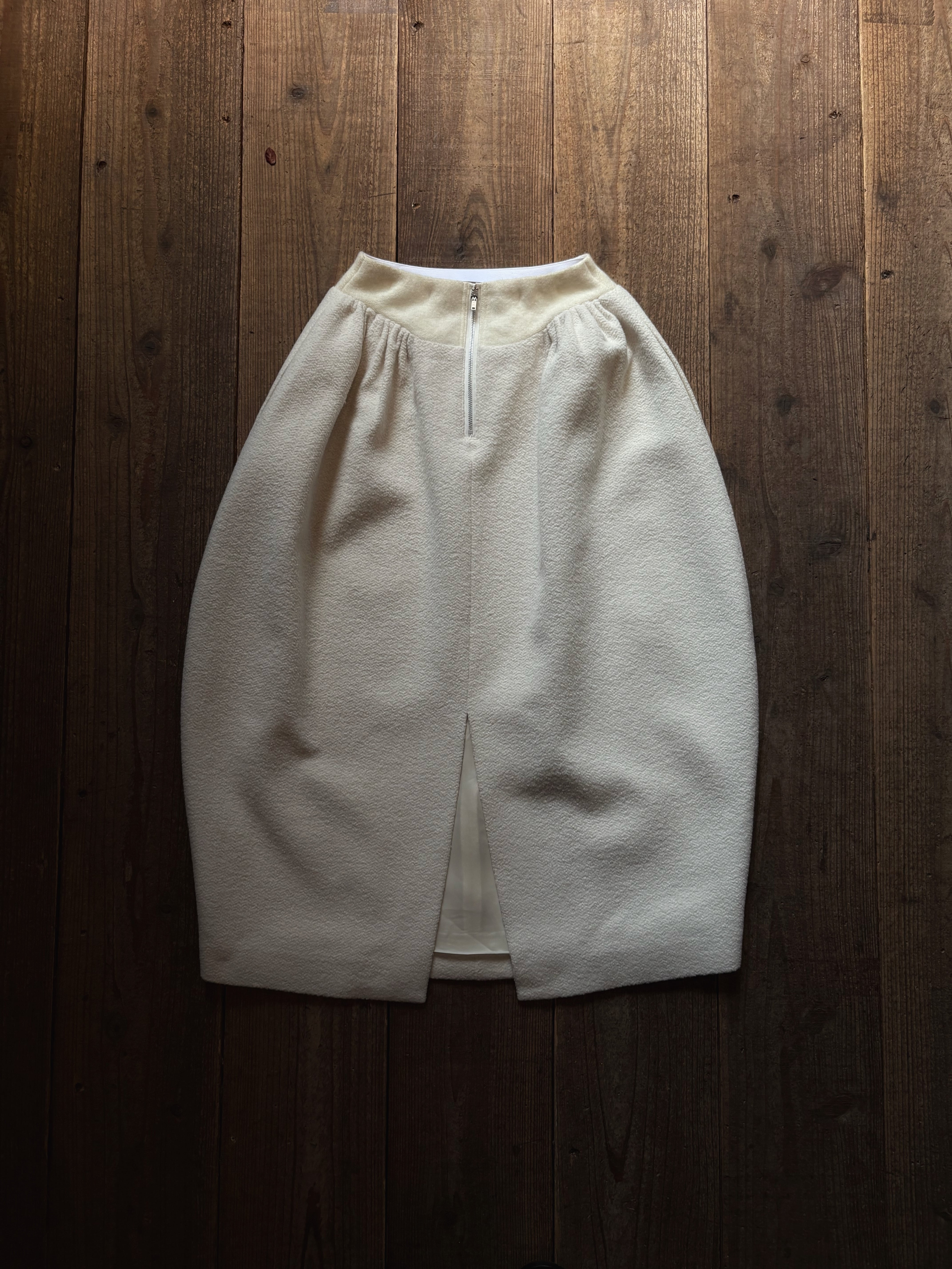 こちらはオリジナルで織り上げた素材を使用し、立体裁断で仕立てたスカートになります。