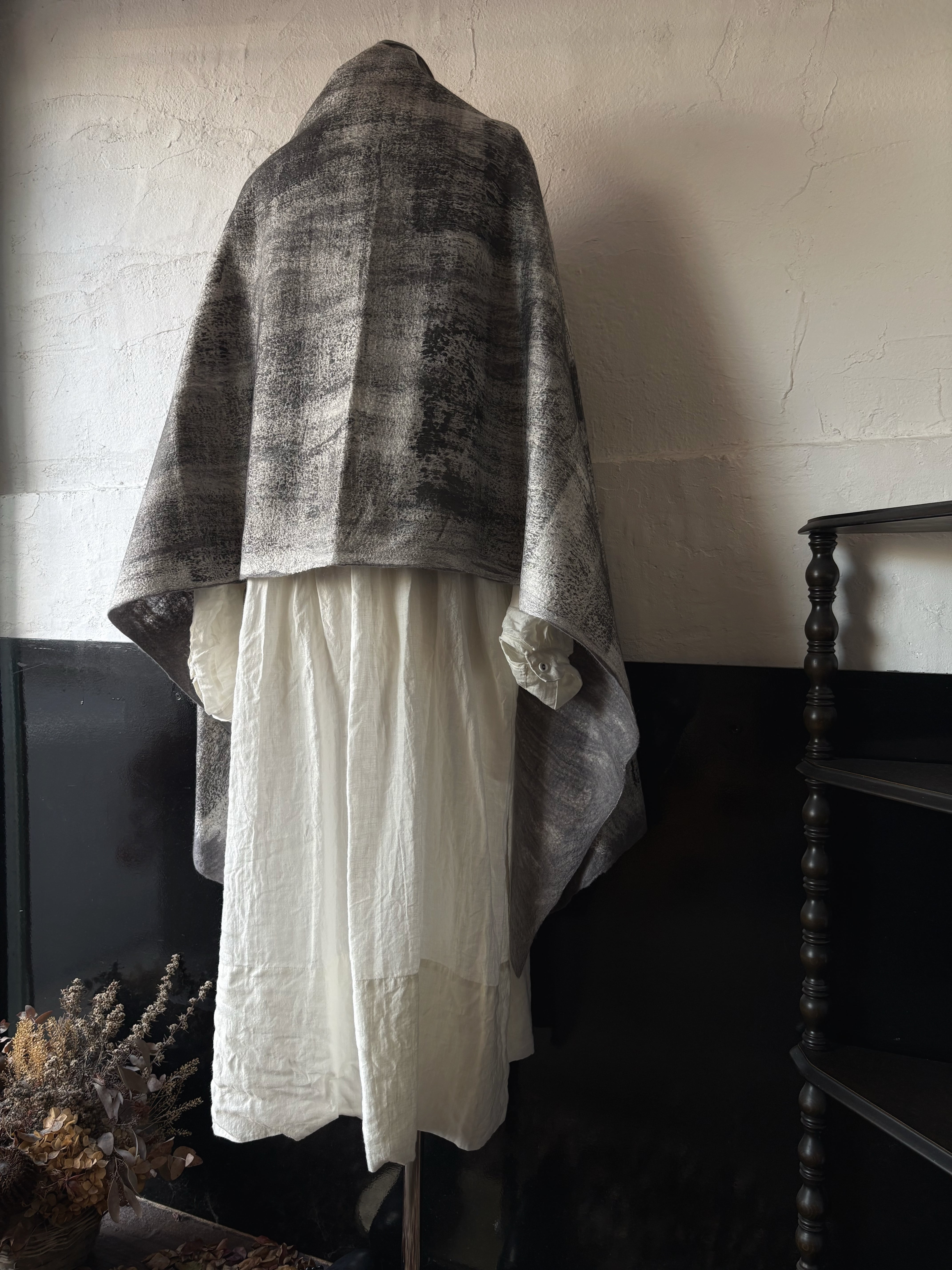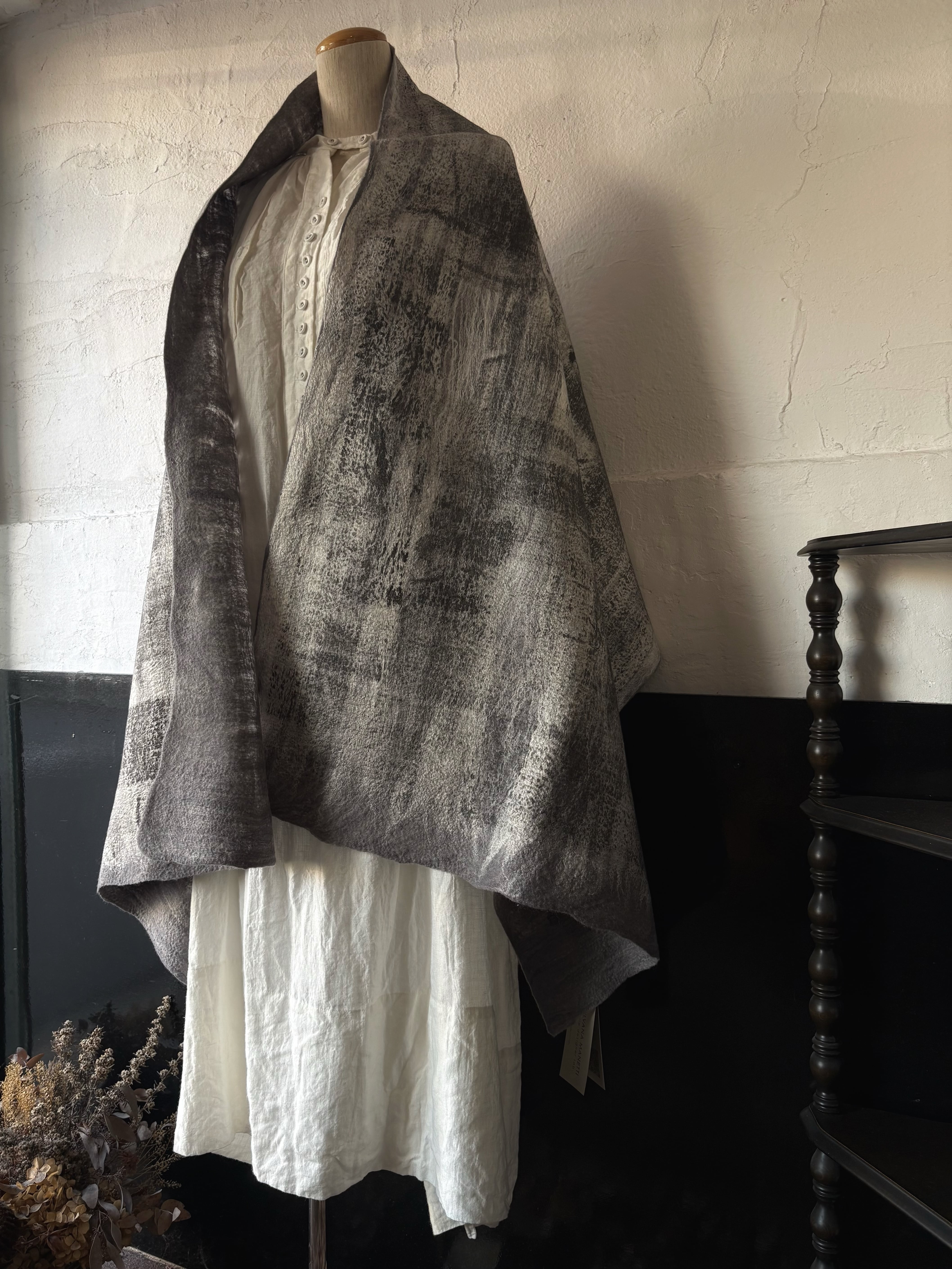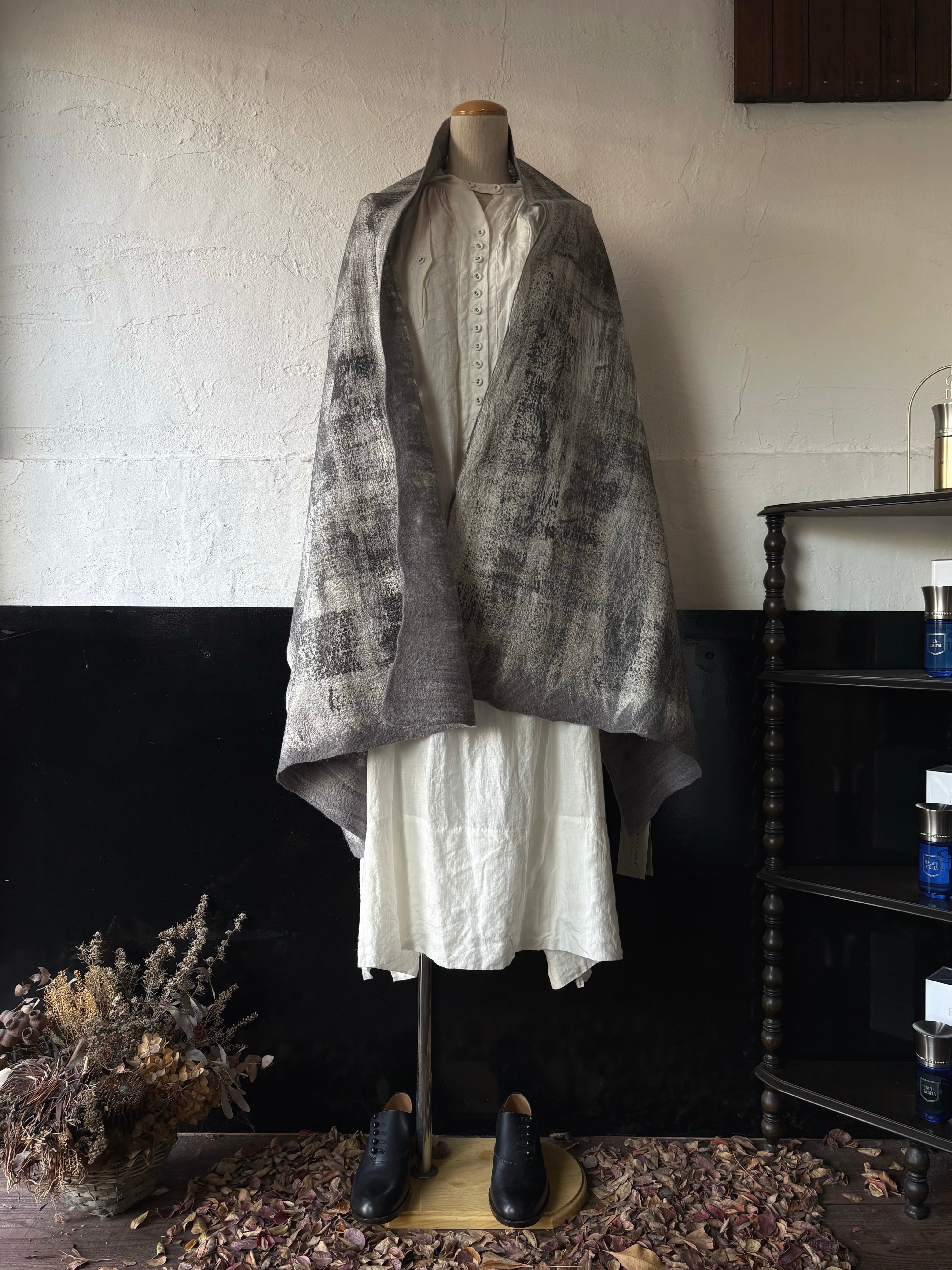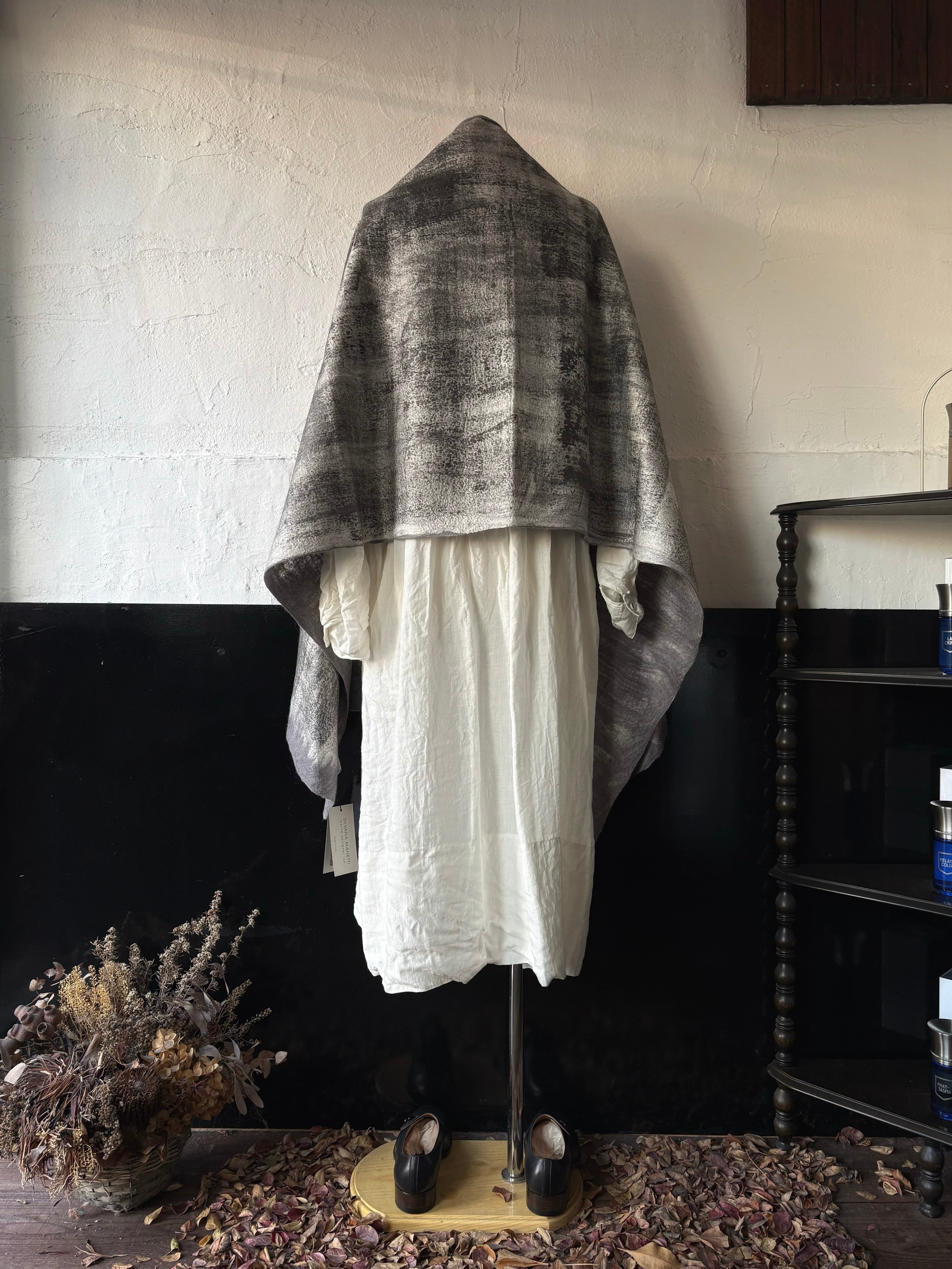 コレクションは、古代から用いられてきたフェルト(不織布)の技法を再解釈し、織る・編む前の原糸を独自の技術で結合させることで、ニットにはないソフトで温かい独特の風合いを持つ製品を開発しています。