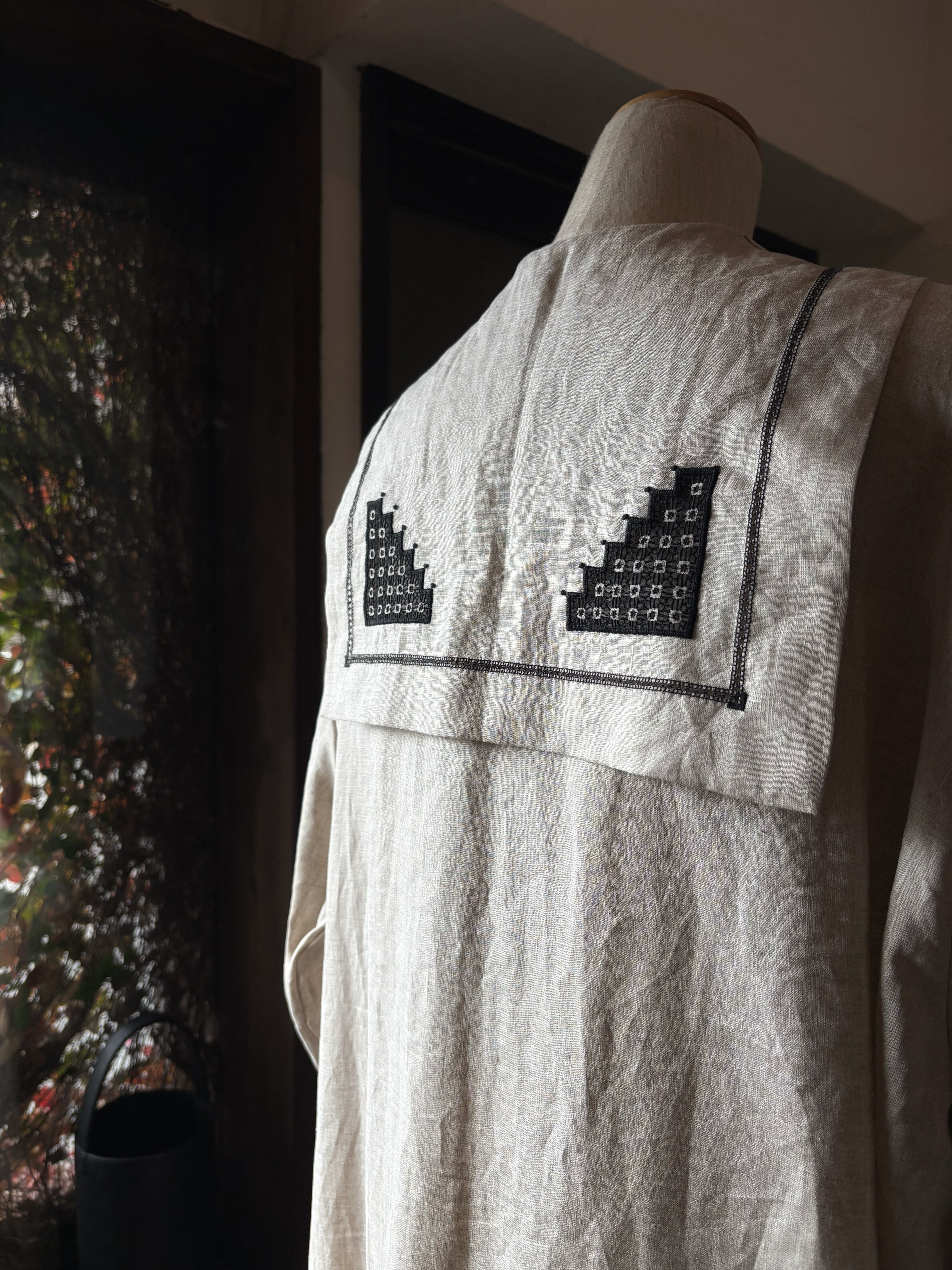 ヨーロッパリネン使用。ドロンワークともいいい絶系や横糸を部分的に抜き取った残りの糸をかかったり渡した糸にステッチをかけるなど布地に携様を描く技法の総称。
