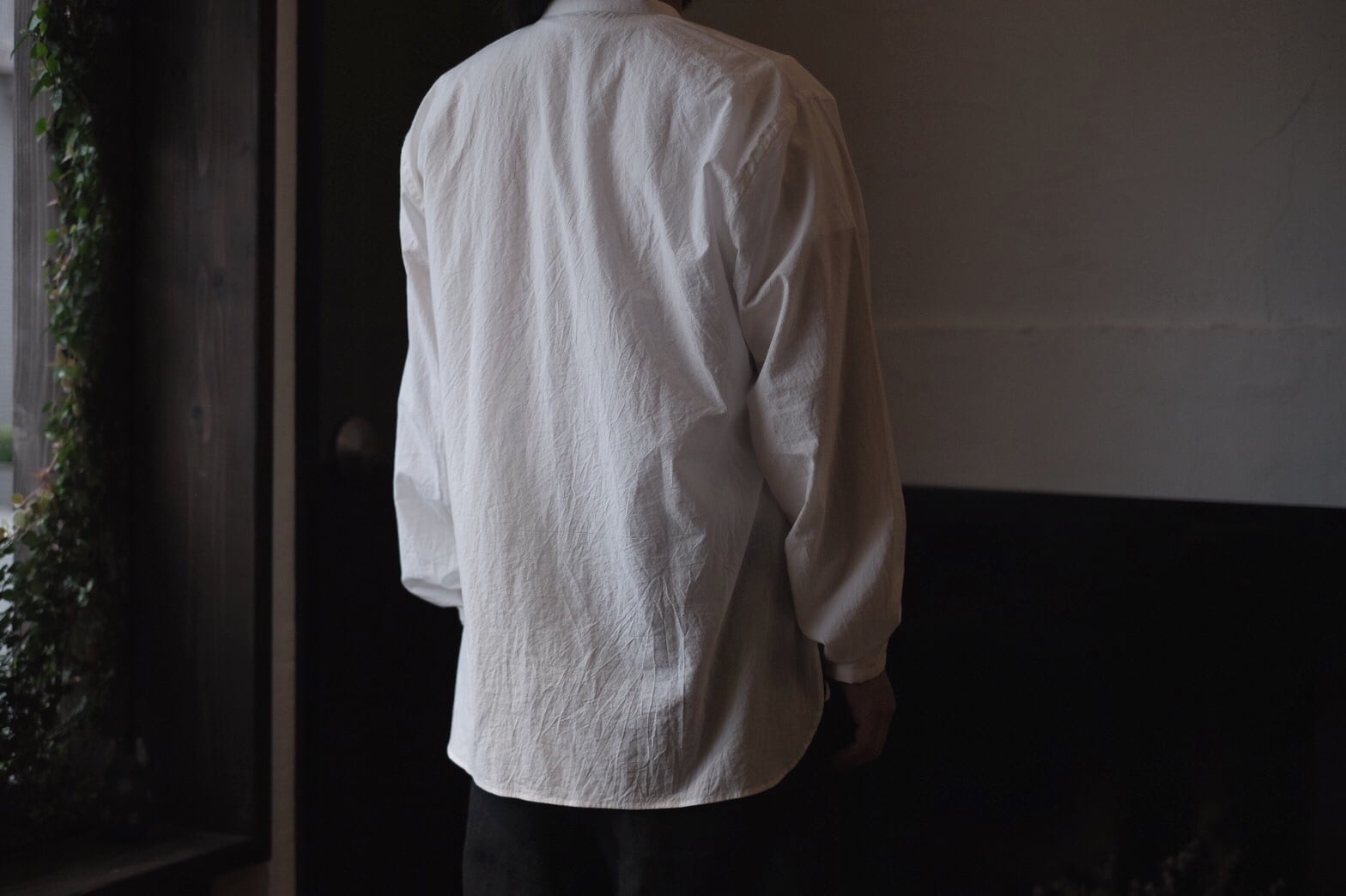 ゆったりとしたプルオーバーシャツで、狭い幅の二股のスタンドカラーが特徴的。