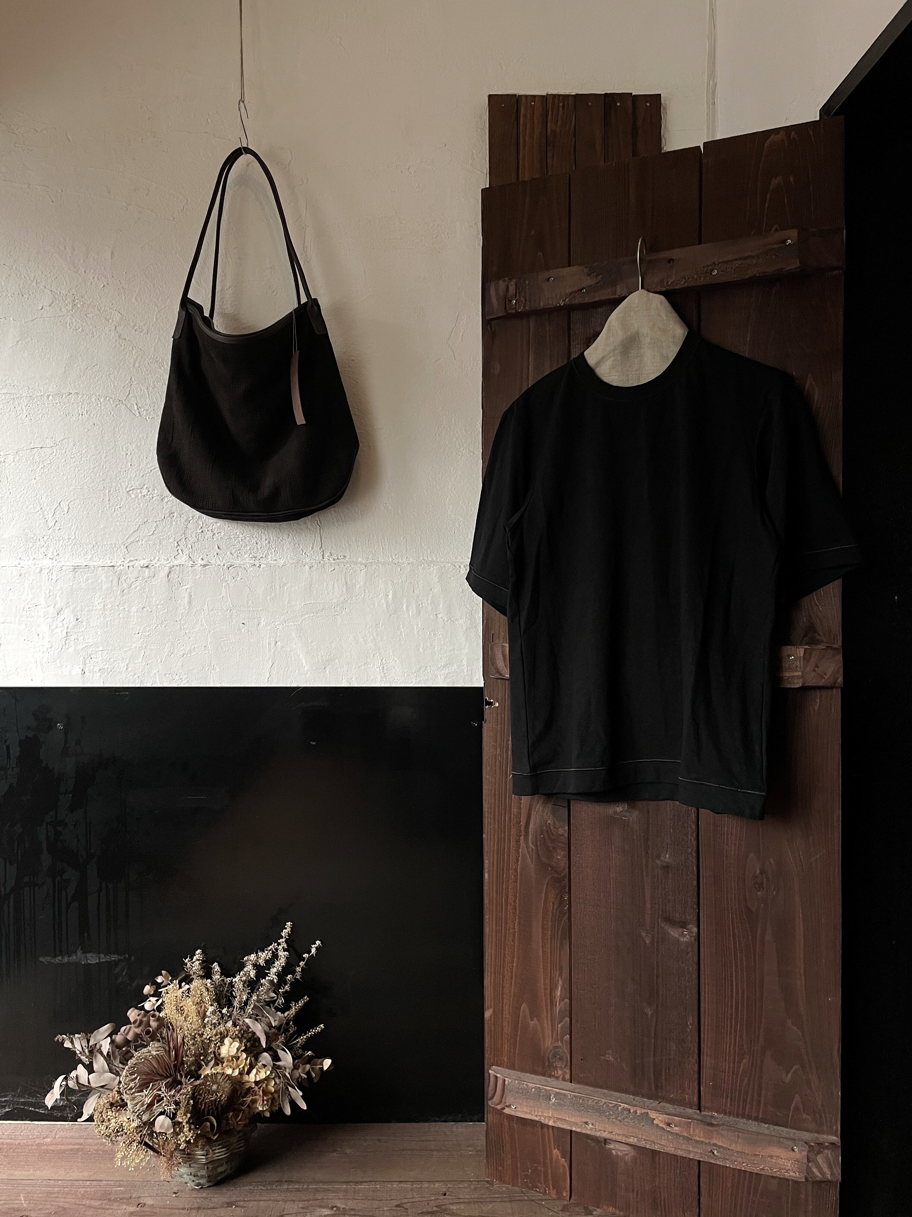 今シーズンで唯一のニット専用ミシンを使用したアイテムで、襟ぐり、袖口、裾口をマタギの3本針使用にして、真ん中のステッチ糸を30番糸配色にしています。