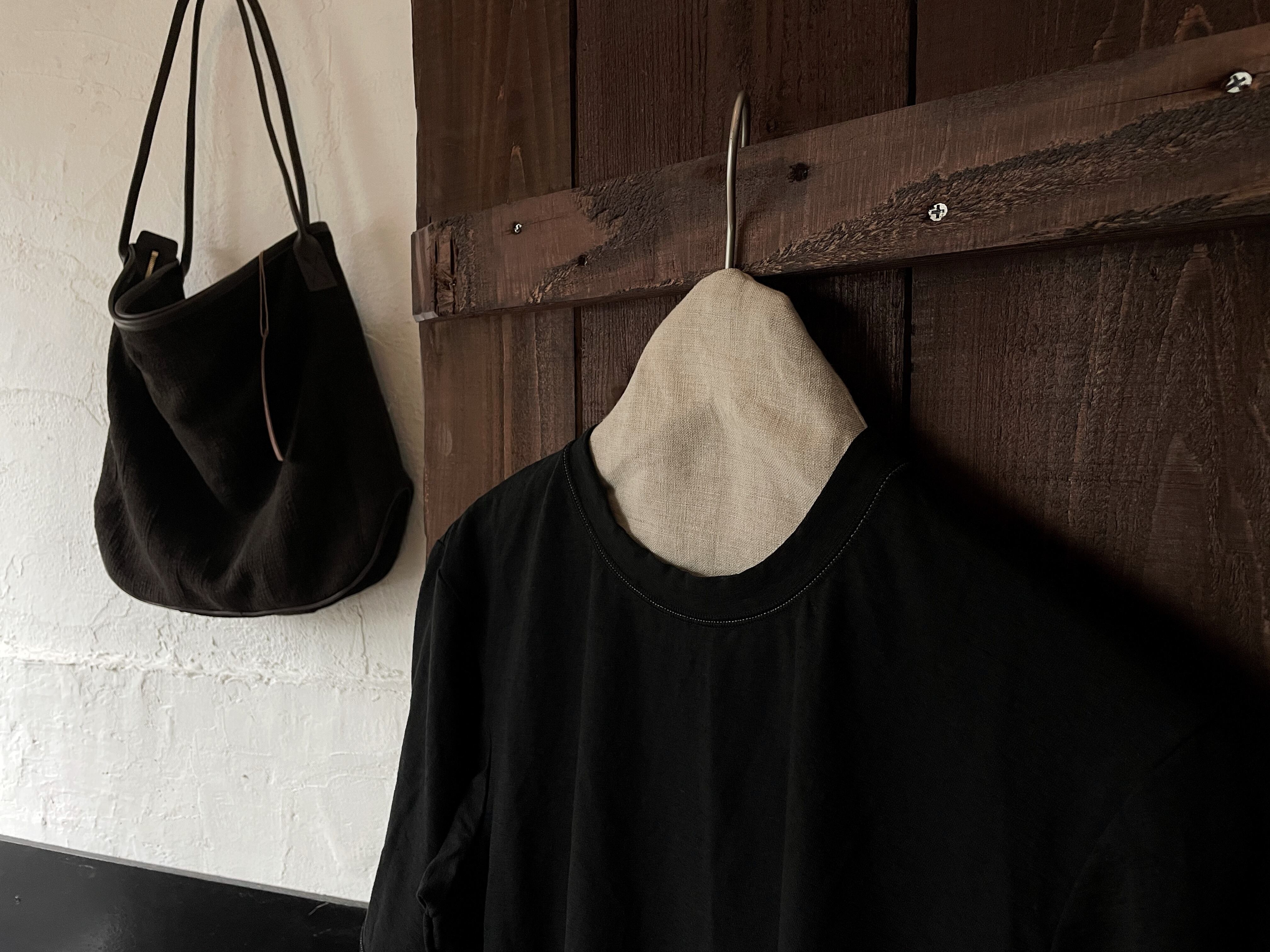 そこで、塩縮加工により生地を強制的に縮め、独特なシワ感とガシガシしたい質感が男らしく、シルケットなしのリネンニットの素朴な風合いはそのまま残した全く新しい素材に変化させました。