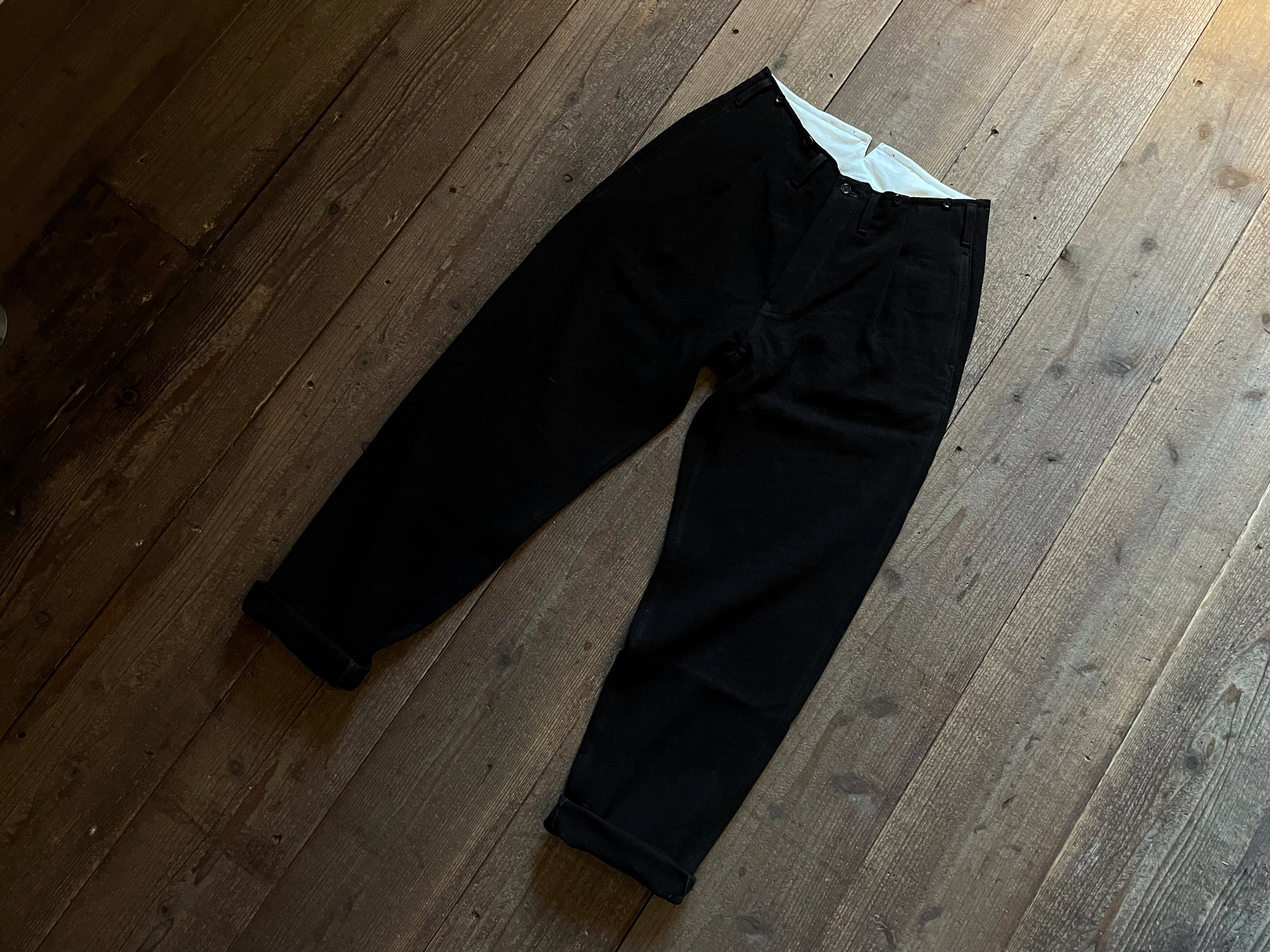 鞄などでも定番的に使用しているベラルーシリネンを奄美大島の泥染で染め上げて仕立てたパンツ。