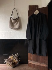 羊飼いのローブやスモックのようなギャザーをふんだんに使用きた洋服をイメージしているのですが、そのままトレースはせず、シンプルなのにギャザーをより際立たせるようなデザインというかんがえのもと、別注にて制作して頂きました。