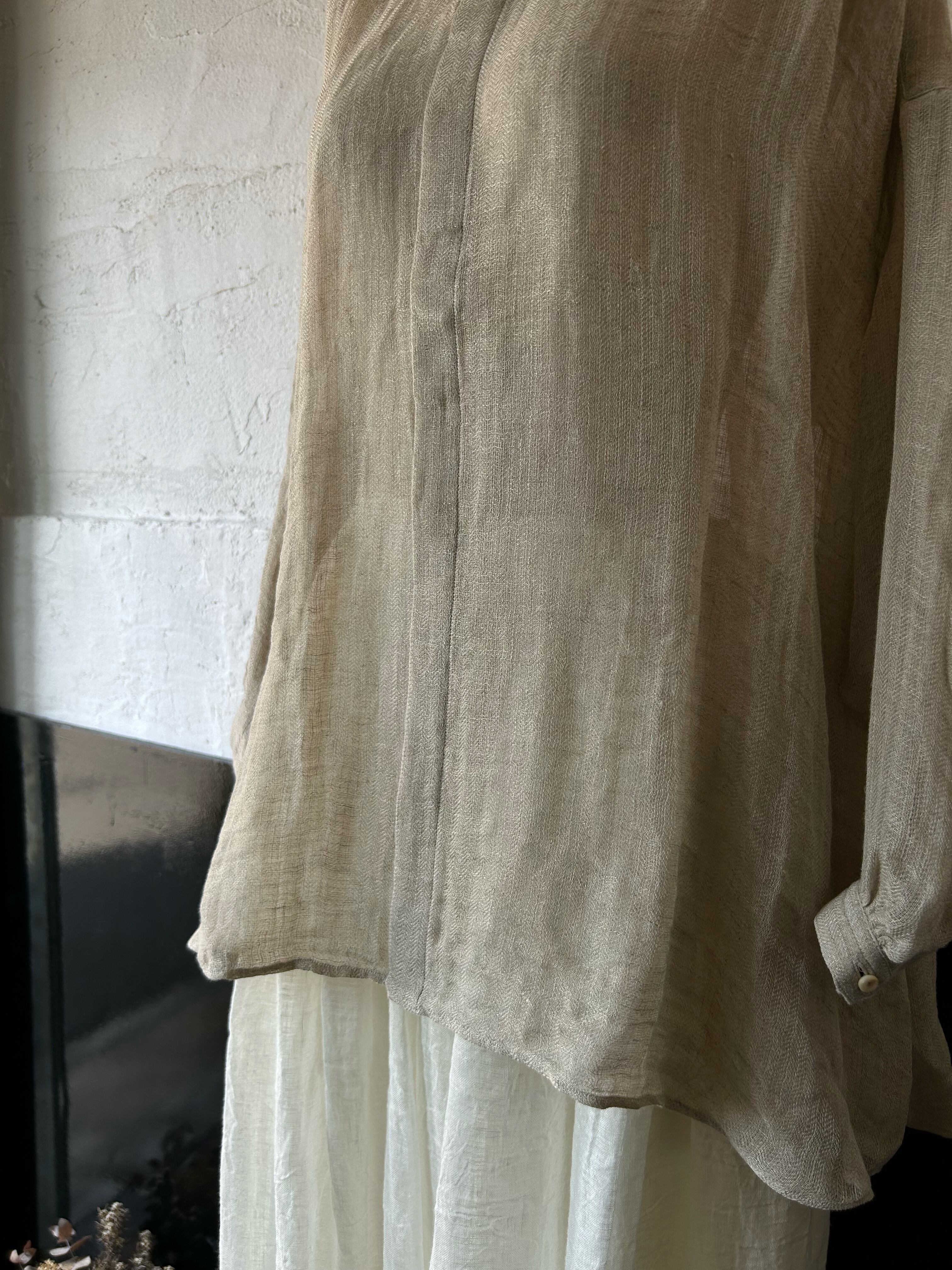 たっぷりギャザーが入ったデザイン、分量感と素材が相まり、ドラマティックなブラウスに仕上がっています。