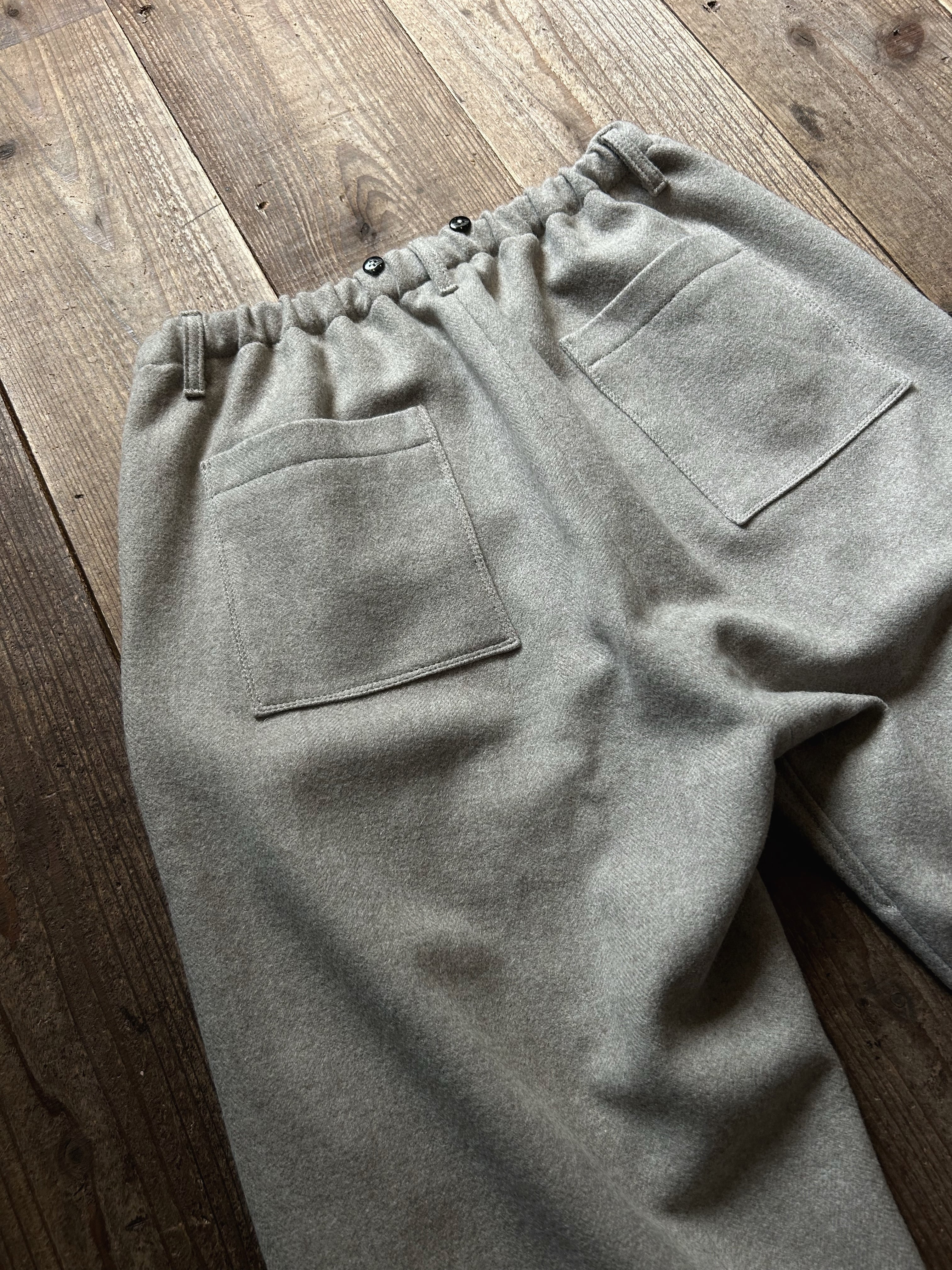 ウエストはサスペンダーやベルトも通せますが、紐を通して調整して穿くいわゆるイージーパンツにもなります。