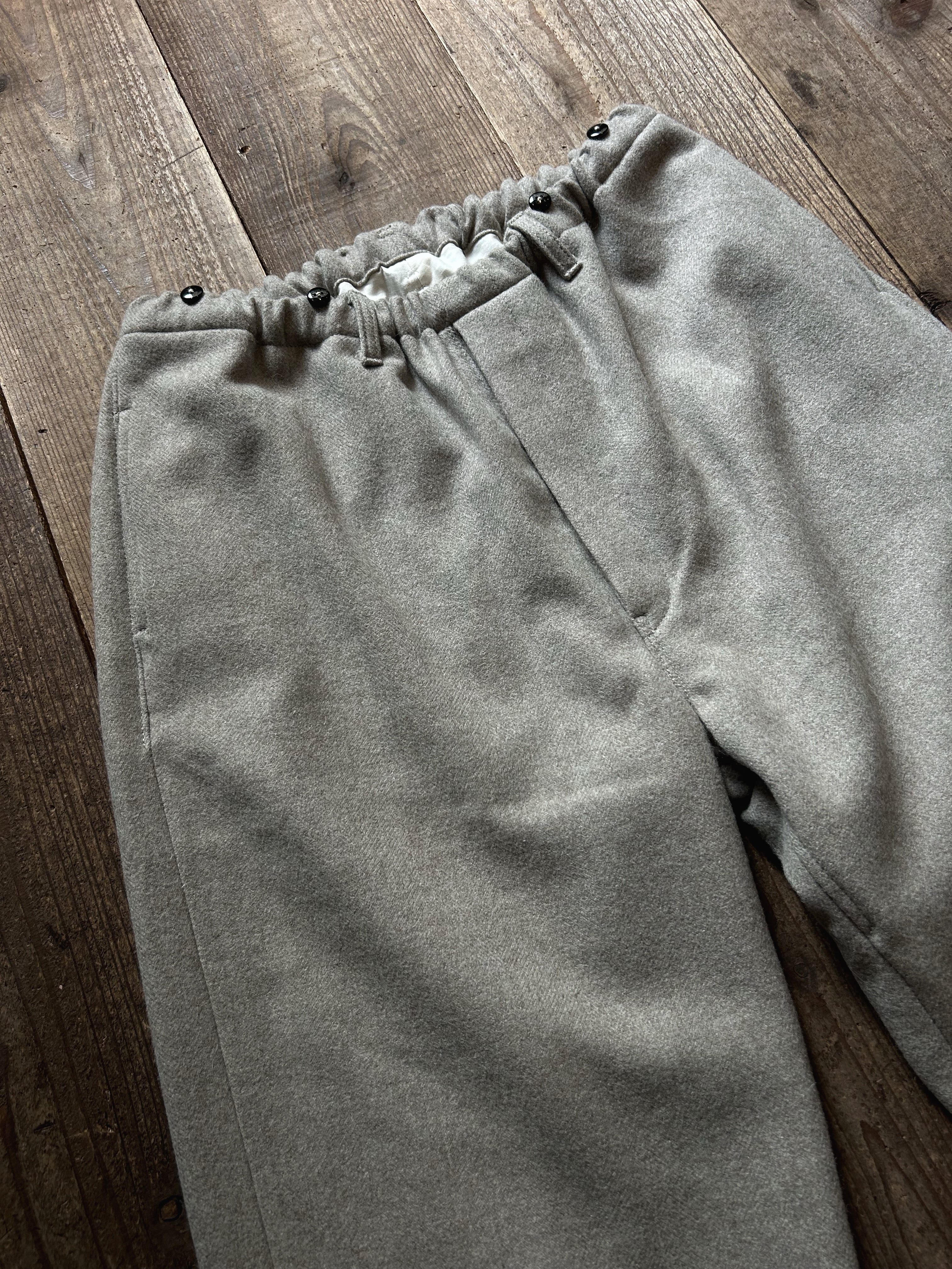 サスペンダーボタンが付いているので、ウエストの紐を軽く締めてサスペンダーをすれば、チャップリンの映画に出てくるような、100年程前の欧米の市井の子供たちが大人からのお下がり、もしくは大きくなることを見越して作られたかなり大き目のパンツをサスペンダーで文字通り「吊っている」ような、少しユーモアのある姿き方ができます。