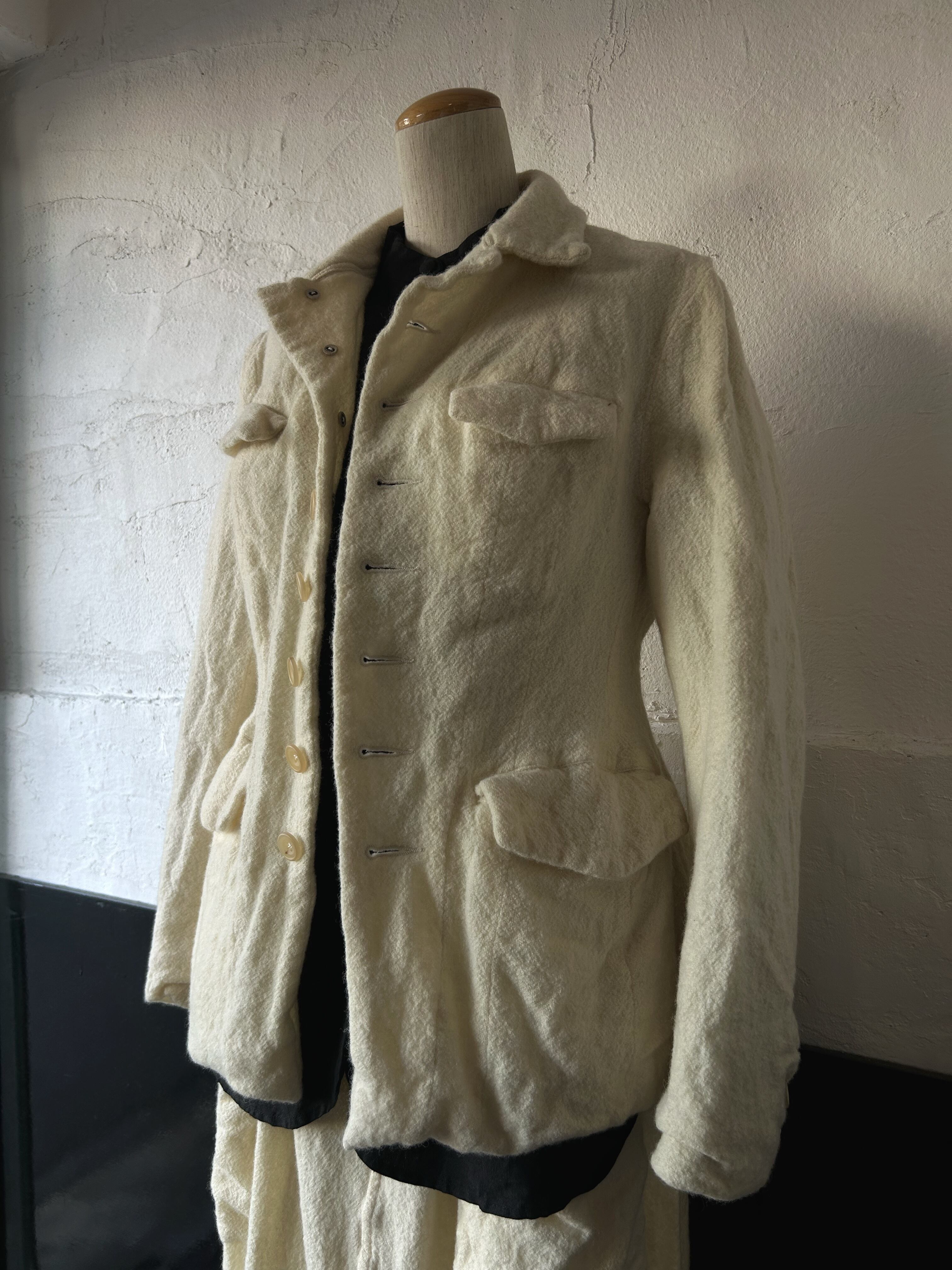 シンプルに縮絨をすることで着込まれて洗い込まれたヴィンテージウール生地を再現 無染色の自然の色合いが美しい羊毛のOff WhiteとBrown と 黒に染色したBlack