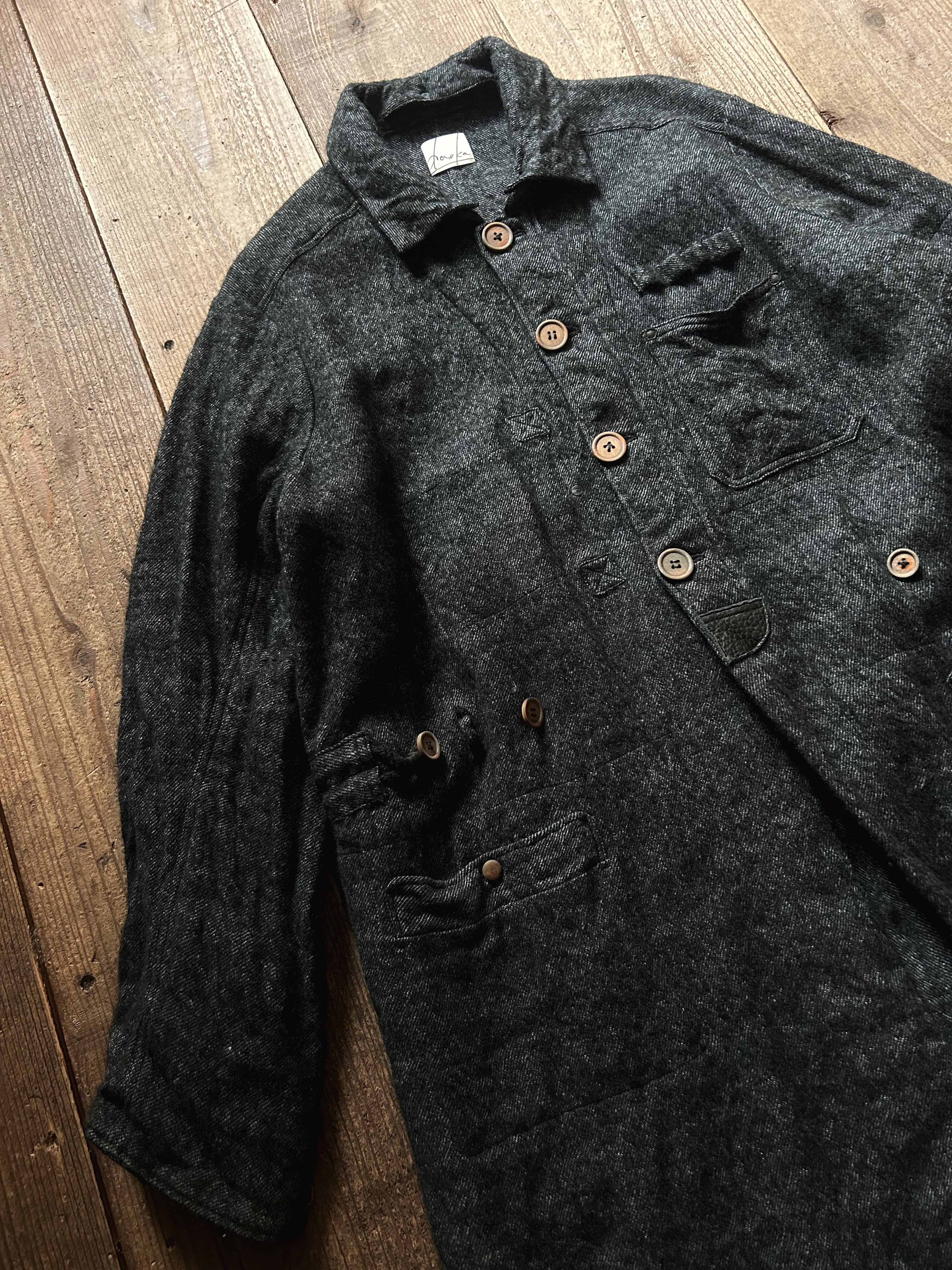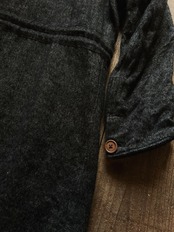釦はウッドボタンを使用しているのですが、通常のウッドボタンはニスが塗られいる為、それを取り除く為に一度鍋で煮て、その後に一点ごとにデザイナーが手作業で加工を施しています。